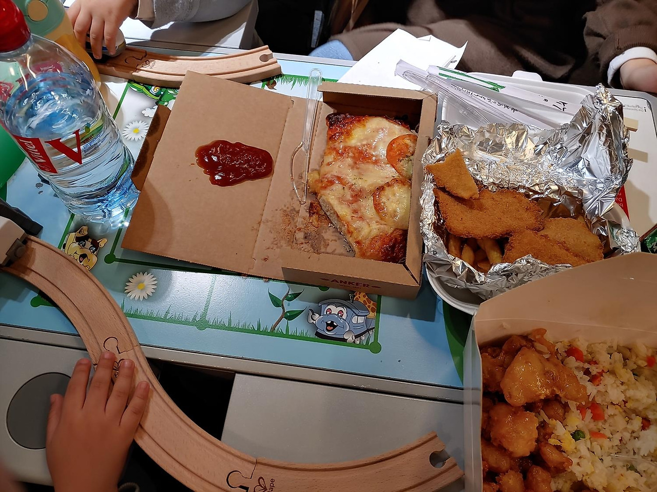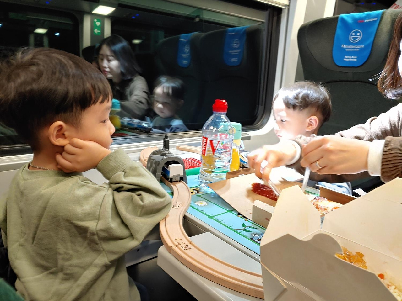 기차에 탑승 후 같이 저녁을 먹기 위해 온이를 잠에서 깨운다. 오래 자고 일어나서 그런지 세온이도 순순히 잠에서 일어났다. 저녁 메뉴로 사 온 음식은 오렌지 치킨과 볶음밥, 피자, 그리고 슈니첼이었다. 전적으로 아이들의 입맛에 맞춘 메뉴이긴 한데, 일어난 지 얼마 안 돼서 인지 아이들은 잘 먹으려 하지 않는다. 포장 음식이라 맛이 없어서 그럴지도 모르겠다. 부다페스트까지는 2시간 30분 소요 예정. 식사를 하고 정리한 후 2시간이 남았지만, 기차 장난감을 꺼내 주니 아이들은 신이 나서 놀기 시작한다. 기차에서는 마주 보고 앉을 수 있다는 것이 아이들과 여행에서 정말 큰 장점이다. 유럽 내 저가항공이 너무 잘 되어 있긴 하지만, 우리는 가능하다면 확실히 기차가 더 편하다.