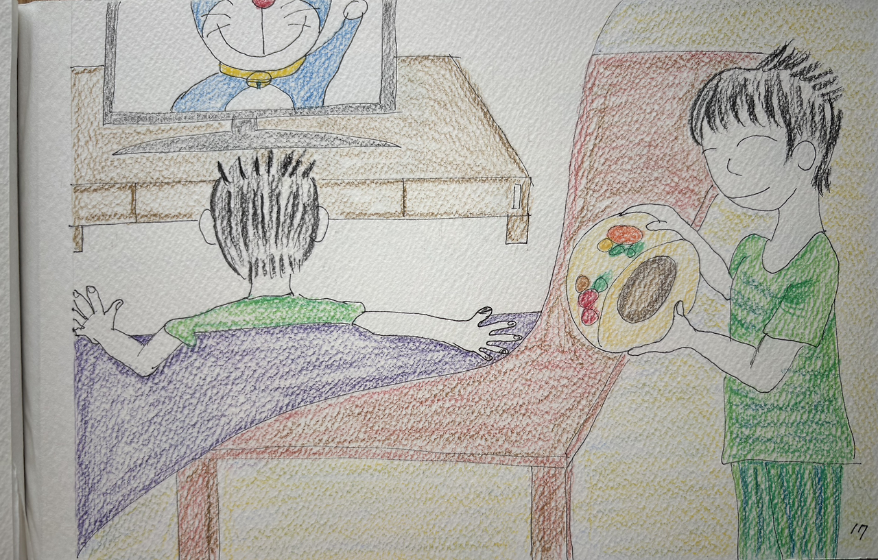 엄마가, "텔레비전 너무 많이 보네. 저녁 준비 도와줘~"라고 말했습니다.