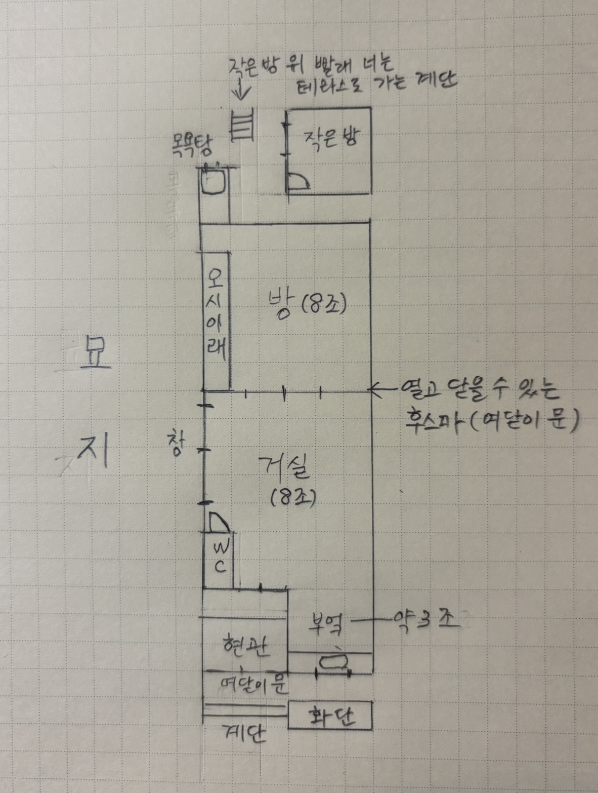 귀신이 나오면 어쩌지? 집 터의 기가 세서 나쁜 일이 일어나는 건 아닐까? 등 겁이 많이 났지만, 오히려 아기 우는 소리 등으로 이웃집에 신경 쓰지 않아도 되고, 덕분에 해도 잘 드니 장점이라고 생각하면 될 일이기도 했다. 각 묘지마다 꽃들이 꽂혀 있어서 꽃밭 같기도 했다. 묘지가 아니라 집이 들어서 있었다면 해가 들 곳이 정말 없었다. 일자로 긴 집이라 양쪽이 다 벽이었다면, 집 꽁무니의 전면 새시 문과 현관문만이 유일하게 빛이 들어올 수 있는 곳이었다. 그나마 새시 문 뒤에도 작은 방이 있었고 빨래를 너는 테라스로 올라가는 철제 계단이 있어서 그늘이 가득했다. 이 묘지는 이 집을 살리는 ‘신의 한 수’였던 것이다.