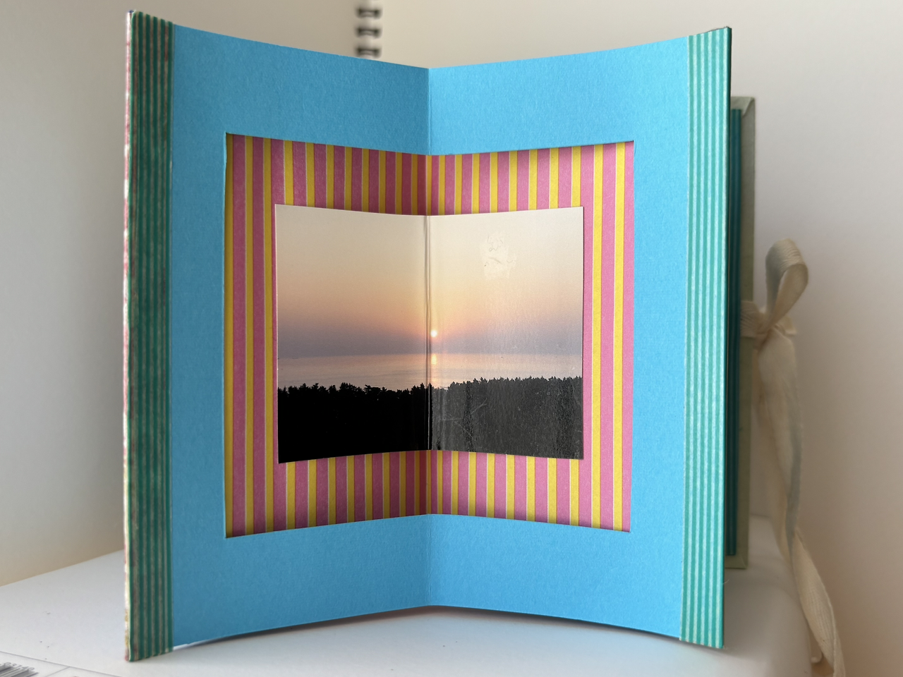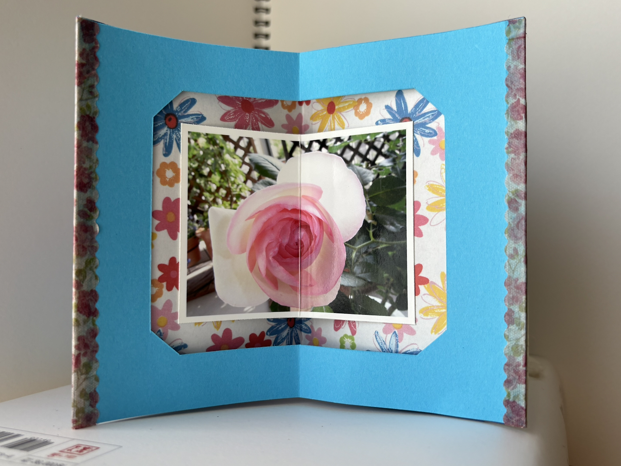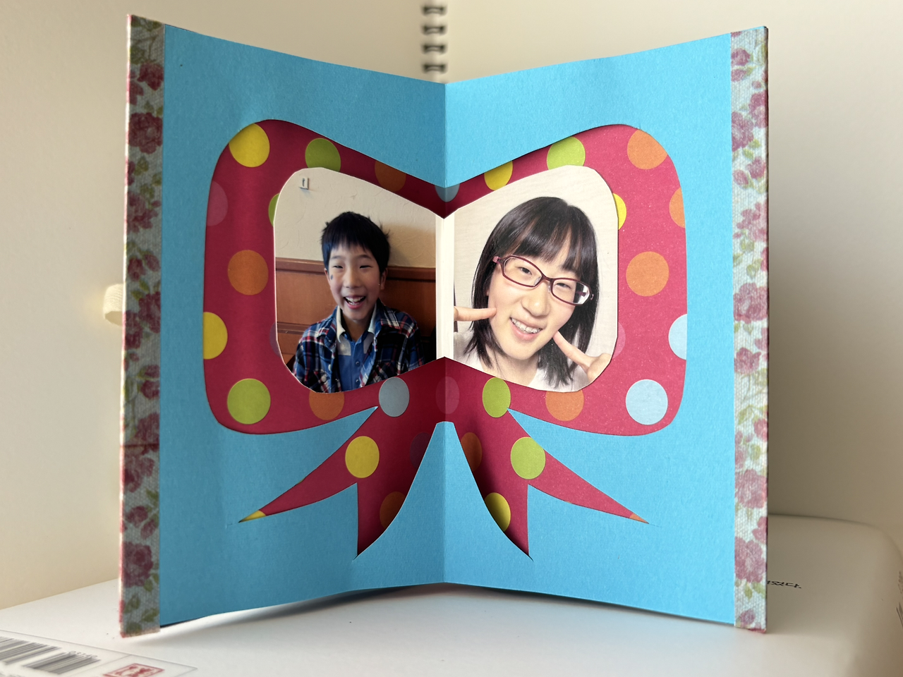 배경화면이 되는 색종이와 액자 역할을 하는 하늘색 종이, 그리고 사진 등의 길이를 달리하여
