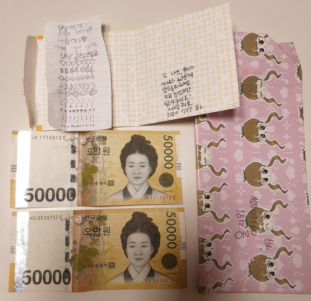 편지 봉투를 열어서 아이들이 쓴 편지와 그 내용물을 보는데 주체할 수 없는 눈물이 눈가에서 흘렀다. (갱년기는 아닌데.)