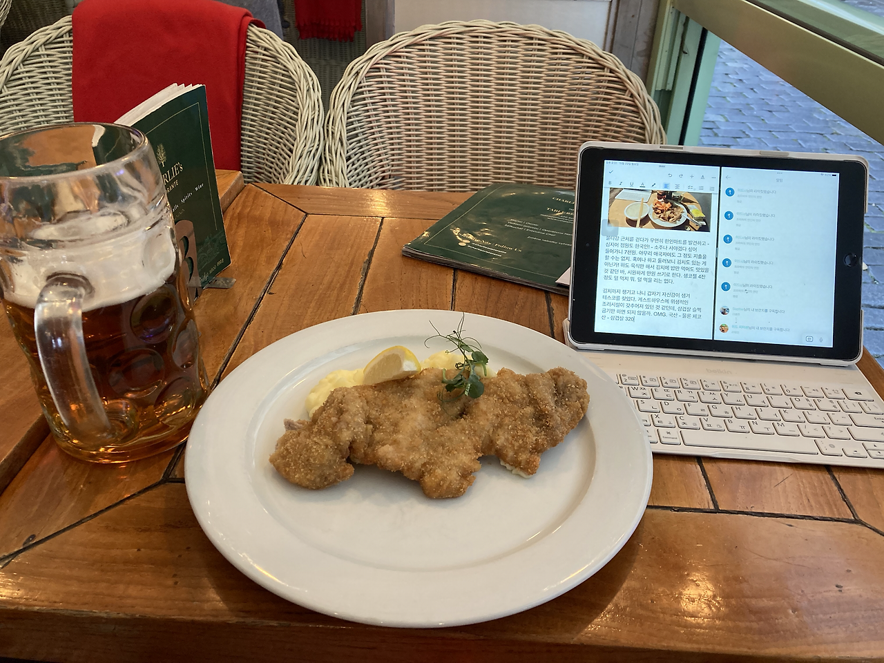 아직 여행서에 나온 체코 음식도 다 못먹어봤기에 - 꼴레뇨는 대체 언제 - 가볍게 스니첼이라 불리는 경양식 돈까스를 시켜보았다. 맥주는 대자로.