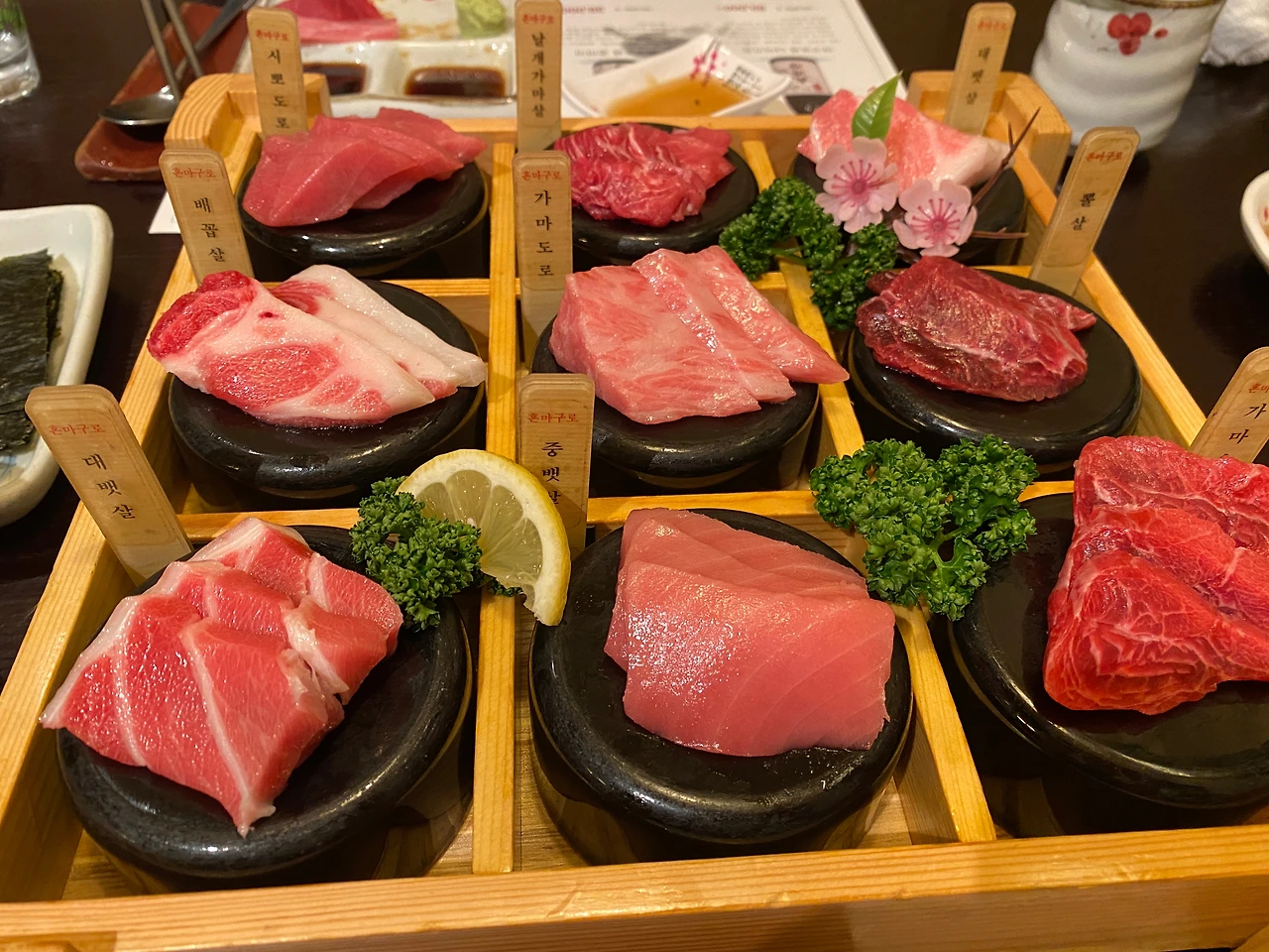 *오오토로(おおトロ) : '오오(おお, 大)'는 크다는 의미로 말 그대로 '대뱃살' 을 말함. 우리나라에서는 '오도로' 라고 많이 부름.