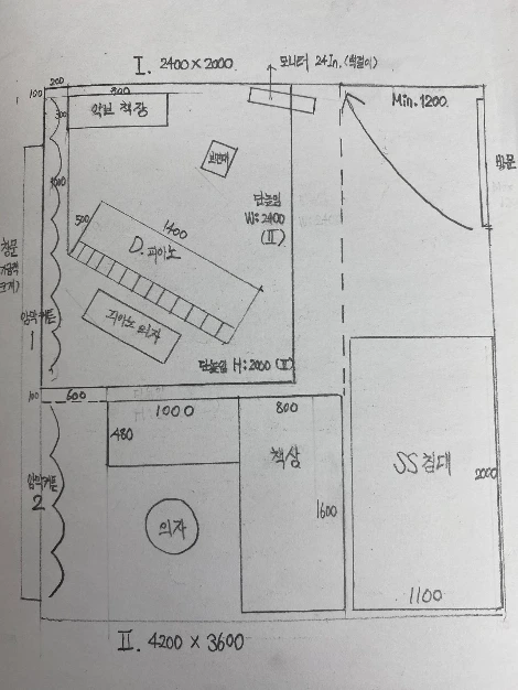 (* 위에서 말한 내용을 상상도로 그려 보았습니다. 공연장 세팅만 모듈로 들어가면 2400×2000, 책상과 침대가 같이 들어가려면 적어도 4200×3600 의 큰 방이 필요하겠네요. 공간 제약으로 현실이 아닌 '꿈' 일 가능성이 높습니다만, 언젠가 이걸 이루겠다는 '꿈' 이 현실을 만들 수 있죠. '멋' 은 상상력에서부터 시작됩니다.)