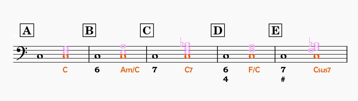 - [A] : 아무런 숫자가 없지만 이는 3과 5가 생략된 것으로, 3도 위인 미(E3)와 5도 위인 솔(G3)과 함께 연주하라는 뜻입니다. 요즘 쓰는 화성 코드로 말하면 'C' 가 됩니다.
