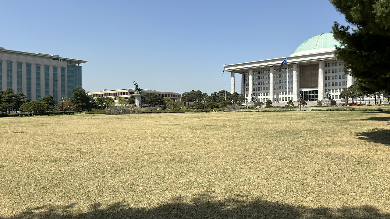 국회 본관 앞에는 거대한 잔디광장이 있는데, 중간에 있는 십자 모양의 포장길을 포함하면 가로·세로 190m로 축구장 면적(7,140㎡)의 5배쯤 되는 1만 평 이상의 압도적인 크기를 자랑합니다. 때에 따라서는 여기에 아이들이 들어가 공도 차는 모습을 볼 수 있습니다.