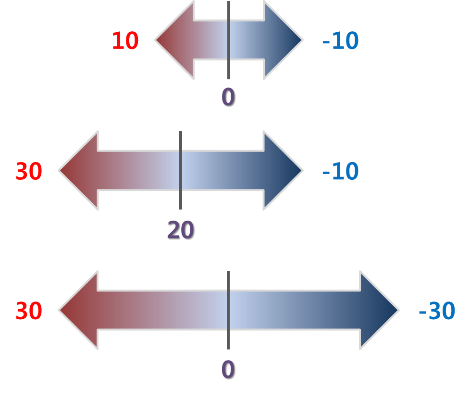 그런데 빨갱이가 무리한 요구를 하기 시작했습니다. 30까지 요구했습니다. 그러면 힘의 균형은 20으로 이동할 것입니다. 무리한 요구를 한 빨갱이가 유리해지죠. 이에 대응해서 파랭이도 -30까지 요구를 당겨버렸습니다. 그래서 다시 힘의 균형은 0으로 이동했습니다.