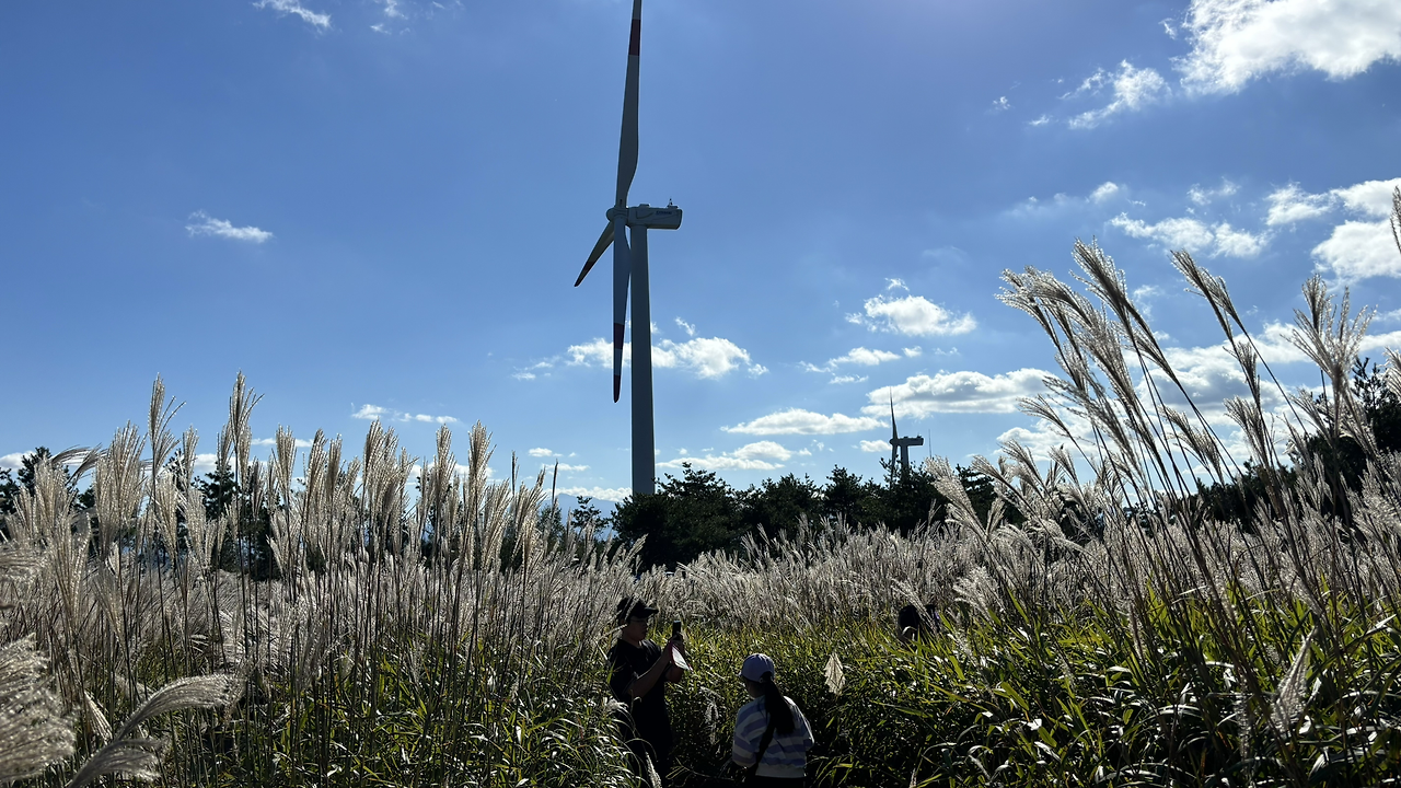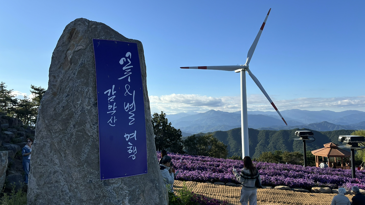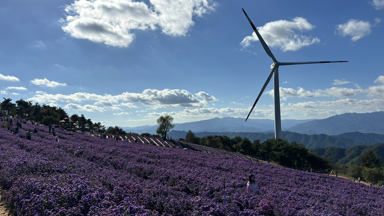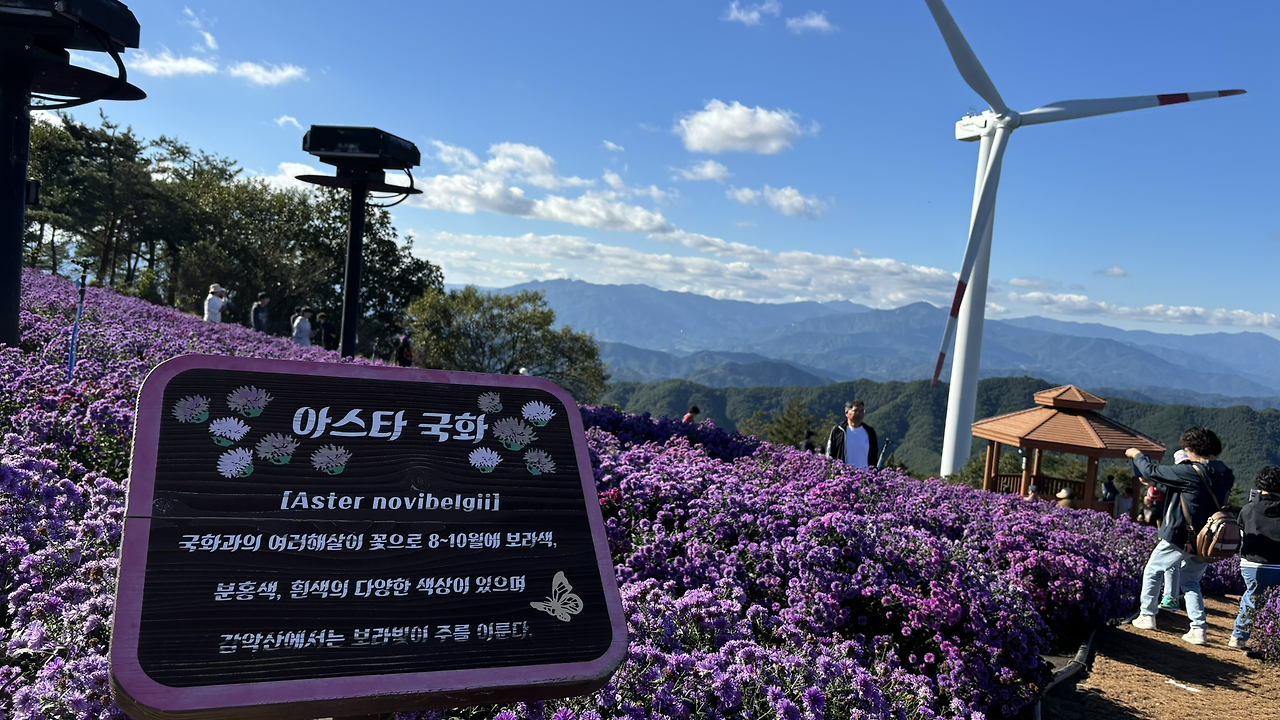 하지만 최근 경남 거창은 한 가을꽃 때문에 군 전체가 들썩이고 있습니다. 아스타(Aster) 국화입니다. 진한 보라색에 이름처럼 '별' 모양인 이 꽃은 은은한 코스모스와는 다르게 강렬합니다. 특히 거창의 아스타 존(Zone)인 거창별바람언덕은 해발 900m 가까운 감악산 정상 부근에 펼쳐져 있는데, 주변의 수려한 산세와 탁 트인 풍광, 그리고 수직으로 높게 뻗은 풍력발전기가 어우러져 가히 가을의 '잇뷰'를 만들어냅니다.