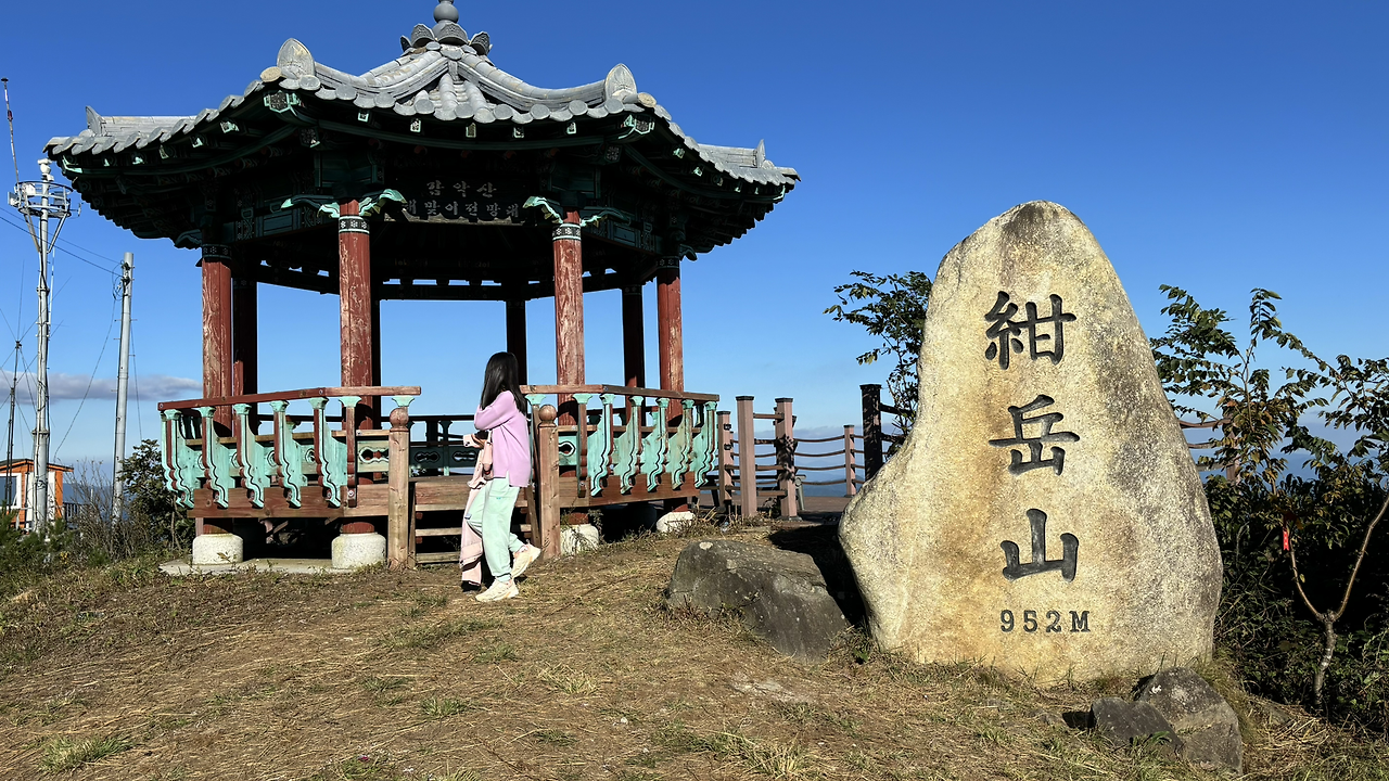 해발 952m 감악산 정상입니다. 파주에 있는 감악산(674m)과는 다른 산이고 높이도 훨씬 높습니다. 소위 '영남알프스'라고 하는 경남 지역의 1,000m급 봉우리들에 거의 뒤처지지 않는 상당한 고봉인데, 보현이도 거의 어려움 없이 올 정도로 편하게 왔습니다. 이런 기회를 놓칠 수는 없지요!