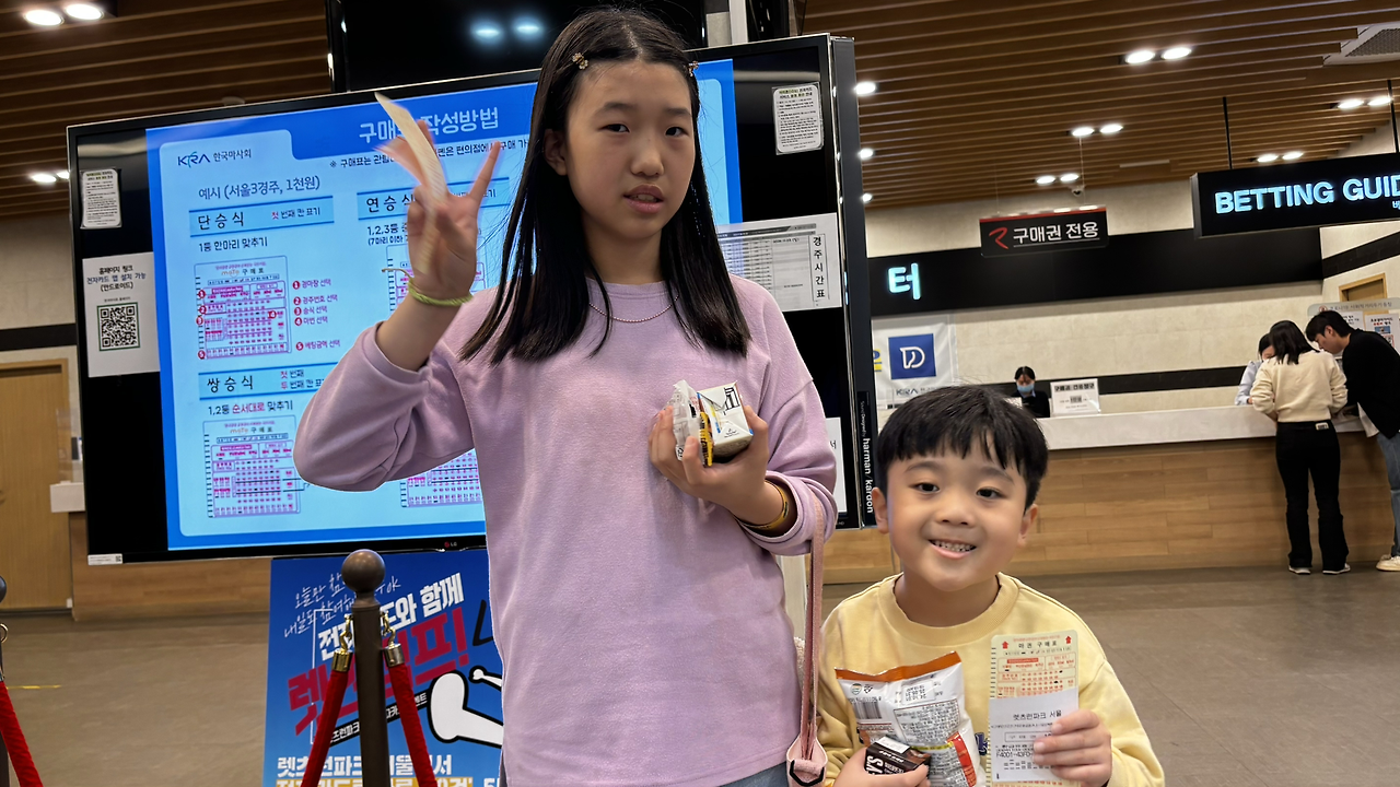 원래는 돈 많이 따려면 경마 정보지도 정독해서 정보도 얻고, 눈치 게임을 좀 하다가 경기 시작 3~5분 전쯤에 배당률 보면서 베팅해야 합니다만, 저희는 경마꾼이 아니라 관광객이니까 그냥 아이들의 직관에 따라 미리미리 마권을 뽑았습니다. 보현이는 7번 말에 걸었고 나현이는 2번 말에 걸었습니다. 7번 말 이름은 '엘도라도강남', 2번 말 이름은 '럭키프랭크' 입니다.