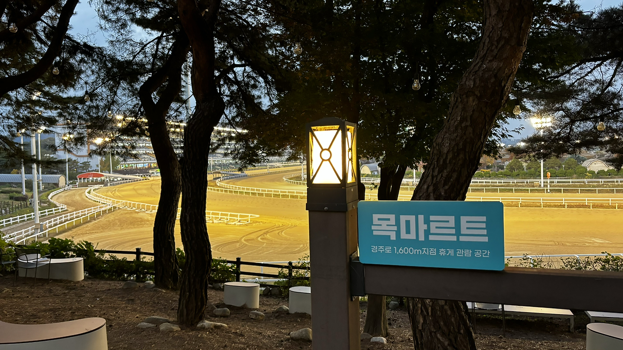 주차장에서 경마장으로 걸어가는 길에 '목마르트'라는 이름이 붙은 야외 휴게 관람 공간이 있습니다. 이렇게 오는 사람들이 많으니 저쪽 경마장 본관으로 가면 너무 복잡하지 않을까 하는 생각이 들었고, 그래서 잠깐 '여기에서 한가롭게 구경할까?' 하는 생각도 들었습니다.