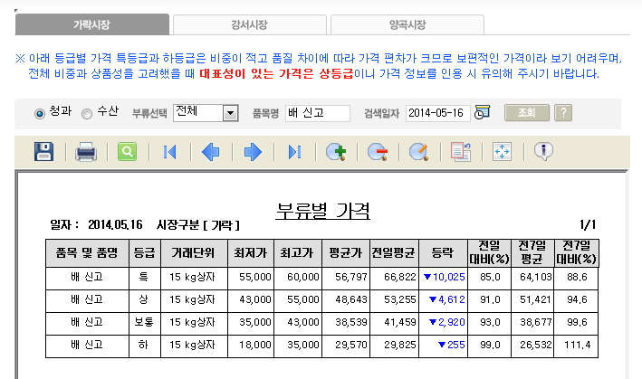 제가 당시에 하도 화가 나서 가락시장의 시세를 조회해서 캡처해 둔 적이 있습니다. 아래는 2014년 5월 16일 자 가락시장의 신고배 가격표입니다. 특품의 경우 15kg 상자가 평균가가 56,797원, 상품의 경우 48,643원입니다. kg 당으로 환산하면 특품은 3,786원이고, 상품은 3,243원입니다.