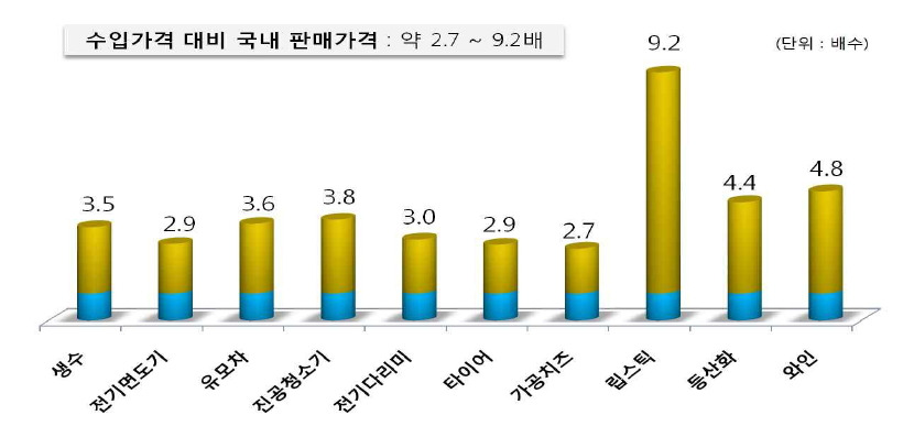 그 이전인 2014년 4월 관세청이 공개한 자료를 보아도, △립스틱이 9.2배, △와인은 4.8배, △등산화가 4.4배, △진공청소기가 3.8배, △유모차가 3.6배, △생수가 3.5배 차이 났다고 합니다.
