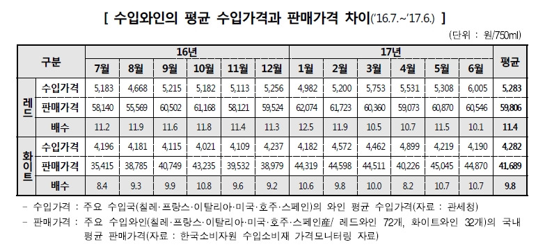 한국소비자원에서 2018년 2월에 공개한 자료에 따르면, 2016.7~2017.6 기간 동안 수입 와인의 평균 수입가격과 판매가격을 비교해 보니 레드와인은 평균 11.4배, 화이트와인은 평균 9.8배 비쌌다고 합니다. 수입가격이 5,000원이었다면 레드 와인은 57,000원, 화이트와인은 49,000원 받고 팔았다는 이야기입니다.