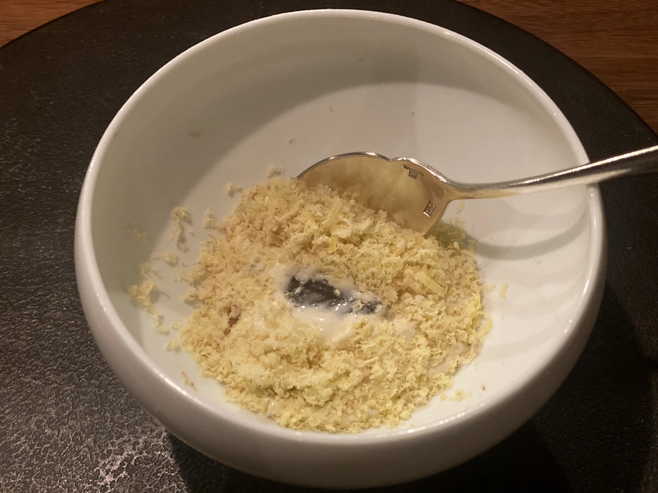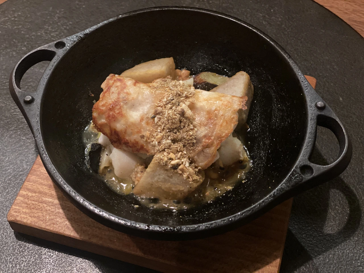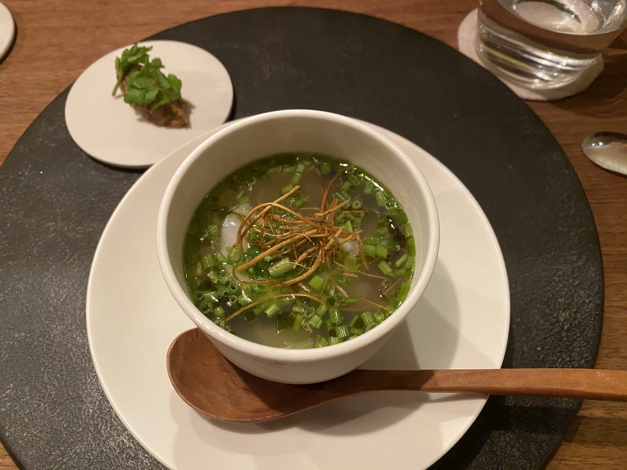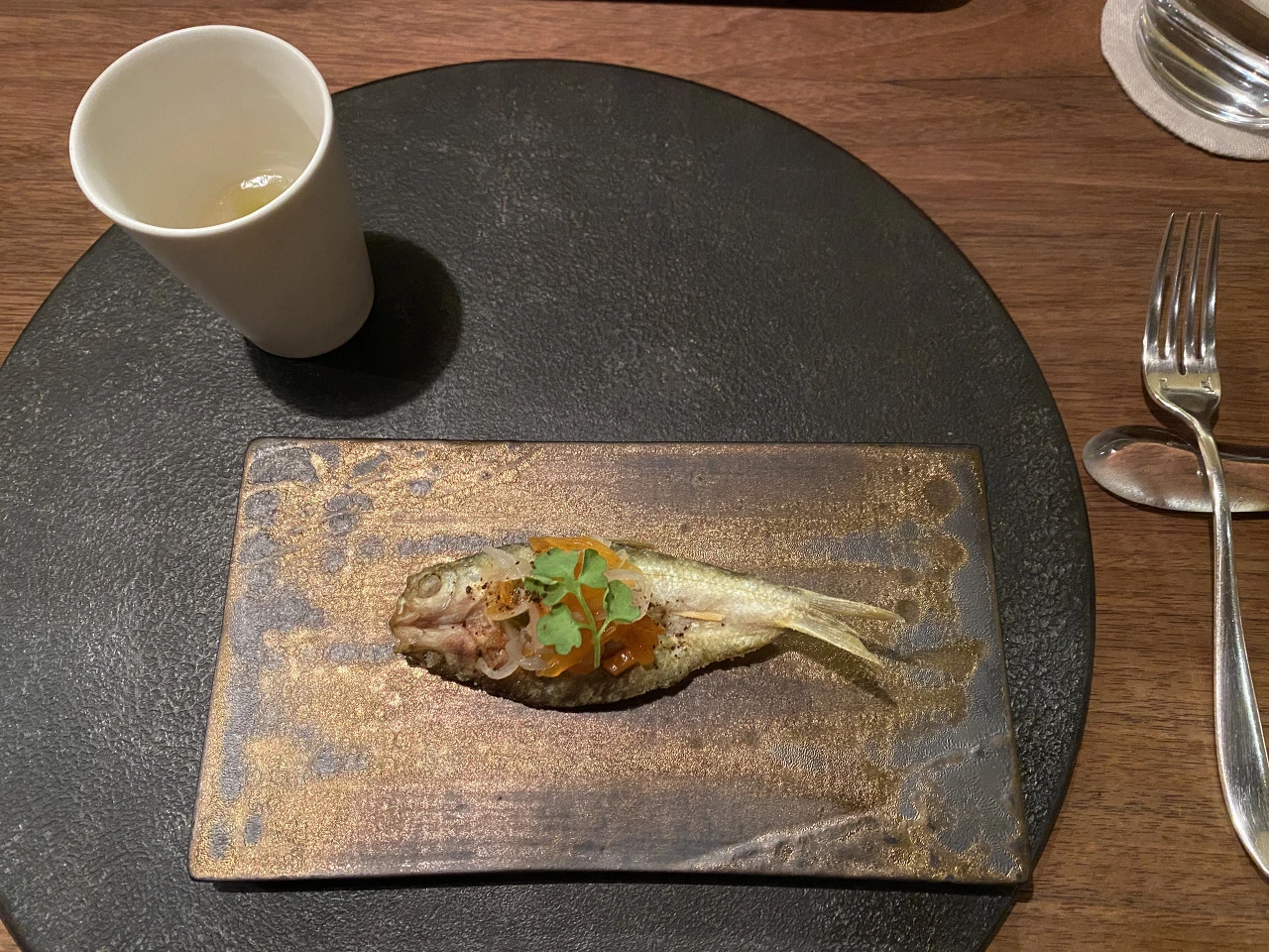 맨 처음 디쉬는 치킨 broth에 들어간 순무와 참붕어? 한입거리 생선요리였다(손으로 그냥 집어 먹는 거라고). 전반적으로 이 날 순무가 들어간 요리가 많았는데, 뭐 개인적으로 채소 매우 좋아하지만, 솔직히 순무 자체가 그렇게 맛있는 채소인지는 잘 모르겠더라... 식감이 좀 물컹하기도 하고. 수프는 너무 짰는데, 순무가 핵심이었으면 좀 치킨 broth처럼 짜고 강렬한 베이스보다는 좀 더 슴슴한 베이스를 사용했으면 좋았을 것 같다. 저 치킨 broth의 짠맛이 너무 모든 것을 장악해 버렸다고나 할까... 생선은 맛있었다.