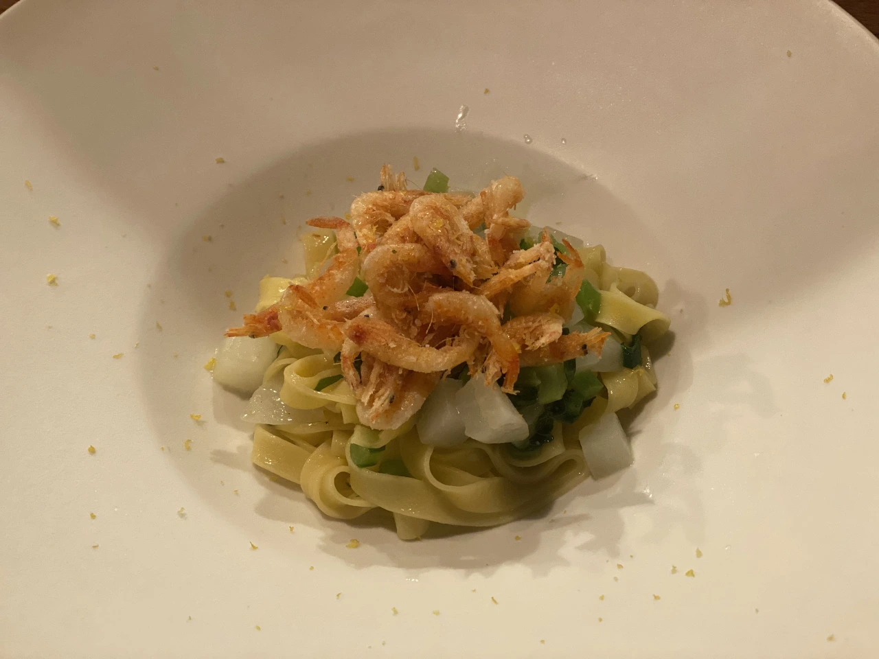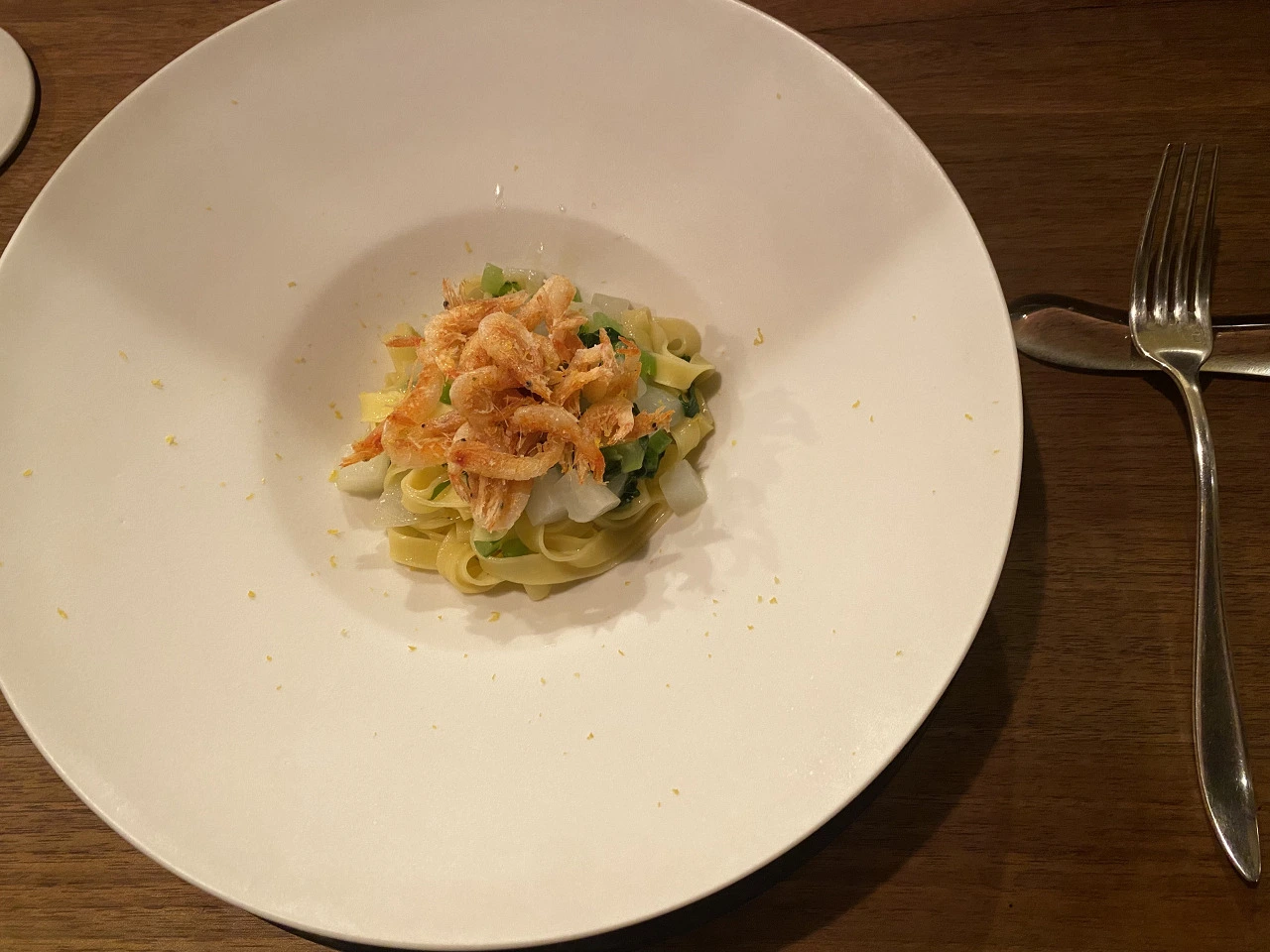 메인 다음으로 사쿠라에비와 또 순무(!!!)가 들어간, 이 식당에서 직접 만든 파스타면을 사용한 파스타가 나왔다. 다 필요 없고, 난 저 사쿠라에비에 꽂혔다... 색깔이 너무나도 예쁜 연분홍(핑크/베이비핑크라고 하면 뭔가 또 그 느낌이 살지 않는다)에 아주 작지도, 크지도 않고, 적당히 짭조름하고... 보기에도 예쁘고 맛도 좋았던 재료. 파스타 전반적으로는 가볍게 먹기 딱 적당한 느낌이었다. 순무가 또 엄청 사용된 게 좀 놀라웠을 뿐... (순무 지옥...)