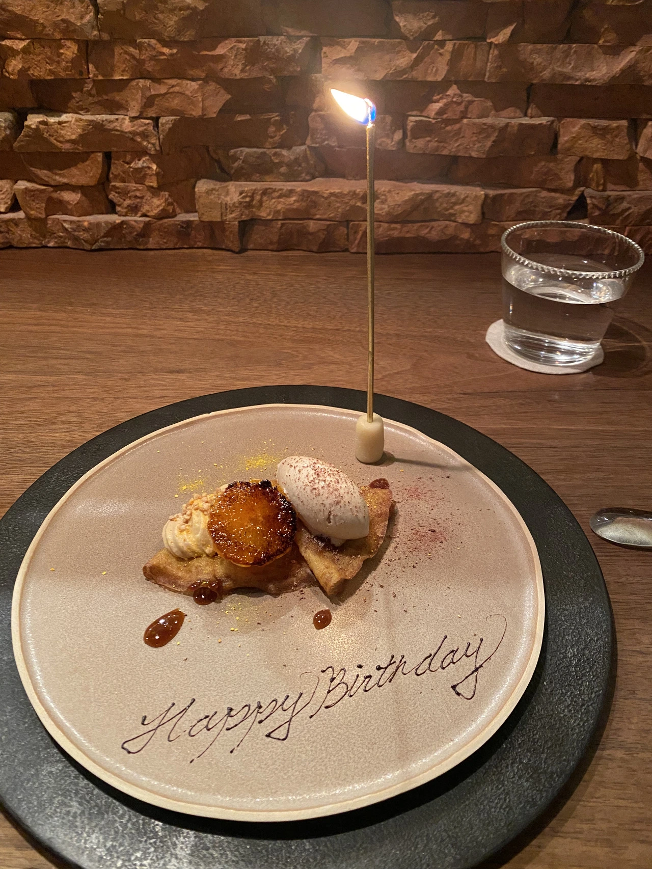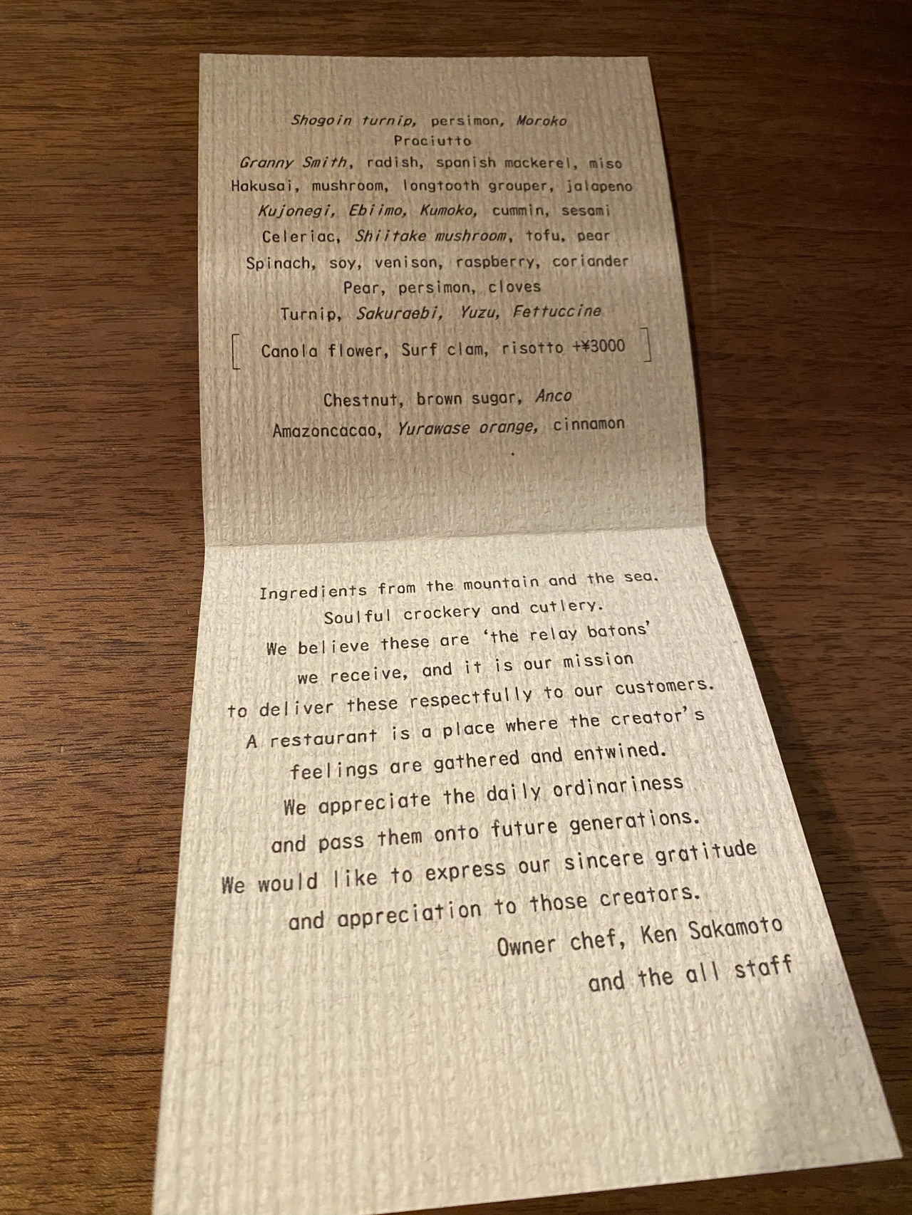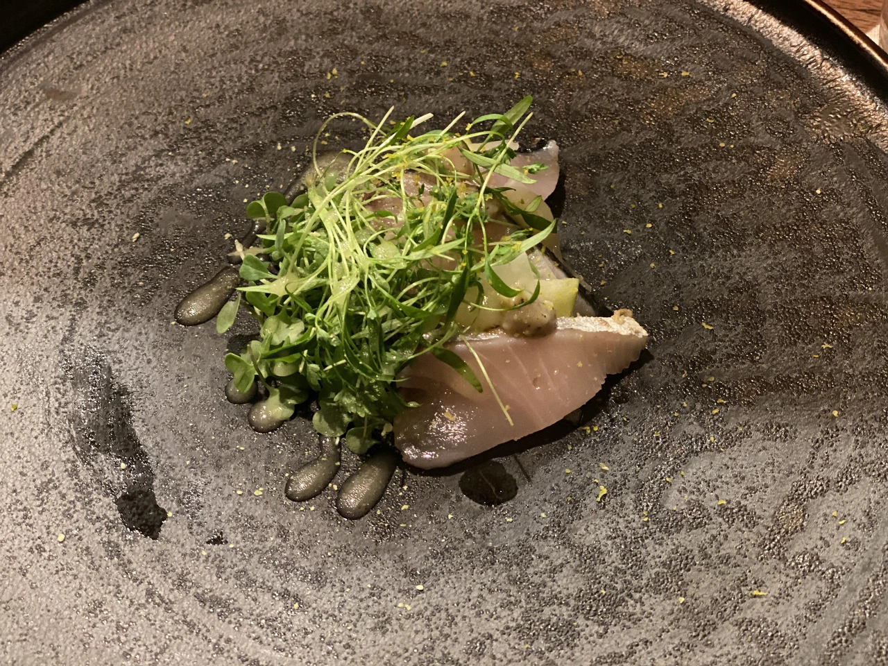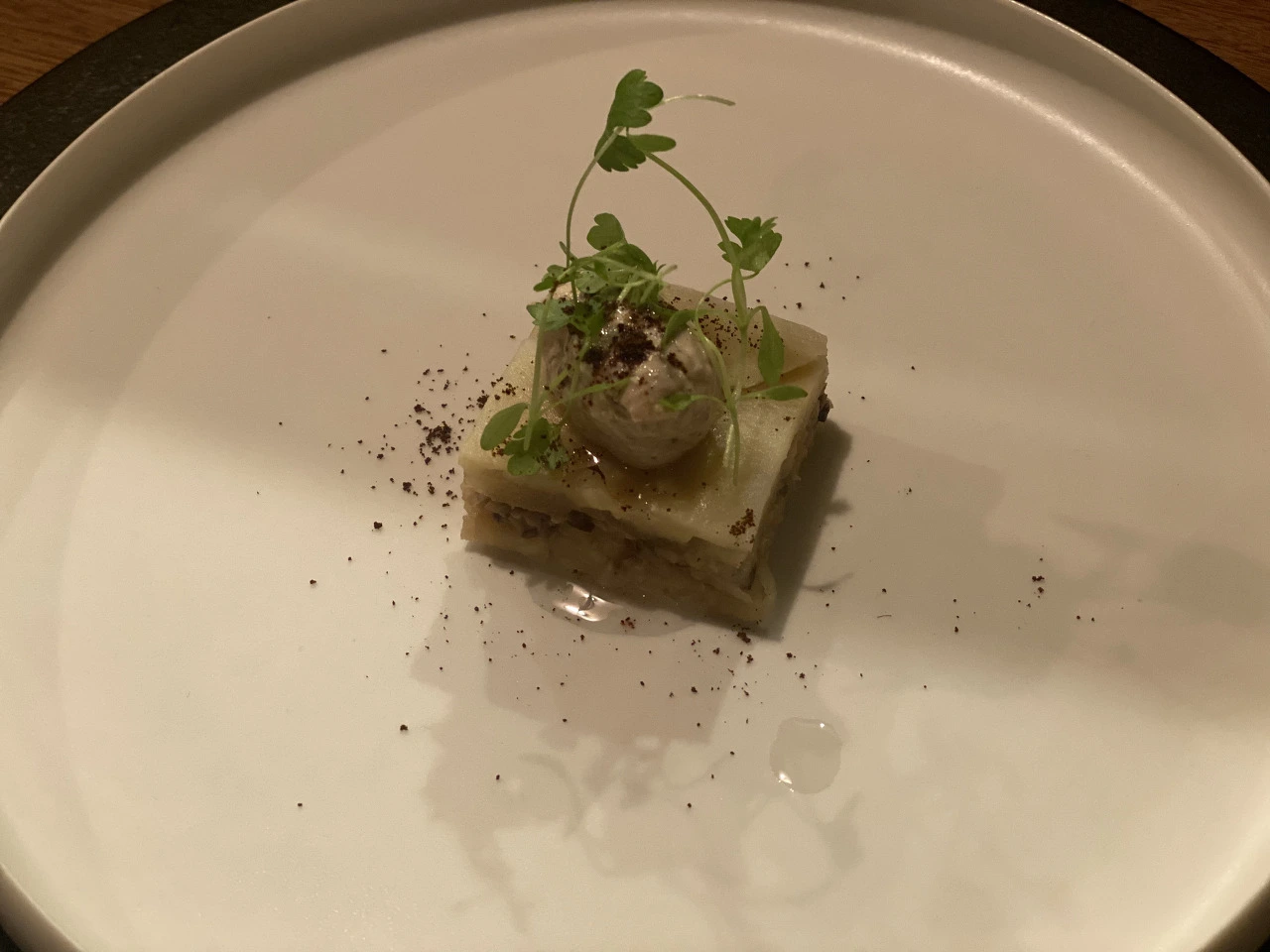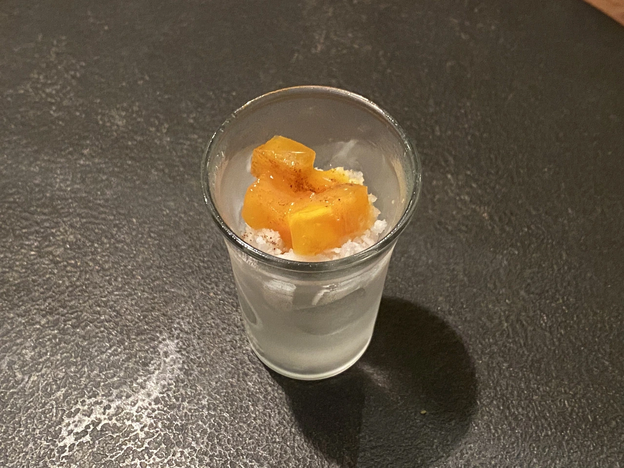 코스 시작 때 셰프님이 인사를 해주셨었고, 중간에 또 오셔서 "맛있어요?"라고 수줍게 한국말로 물어봐주셨다. (찾아보다 알게 된 사실인데, 수년 전 한국에서 현재 미슐랭 2스타인 알라프리마와 콜라보를 하셨던 것 같다.)