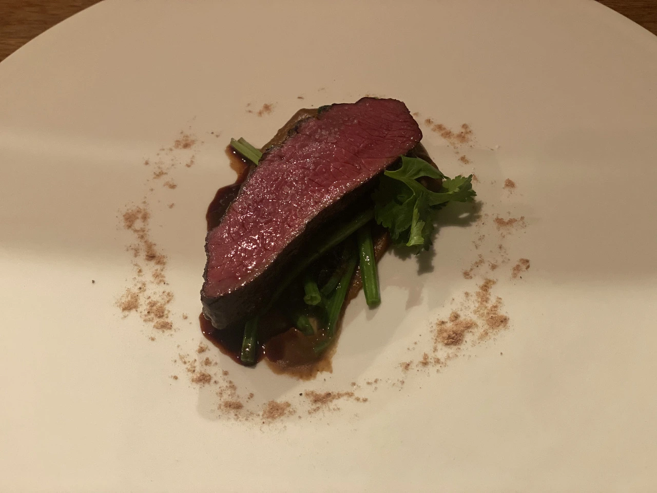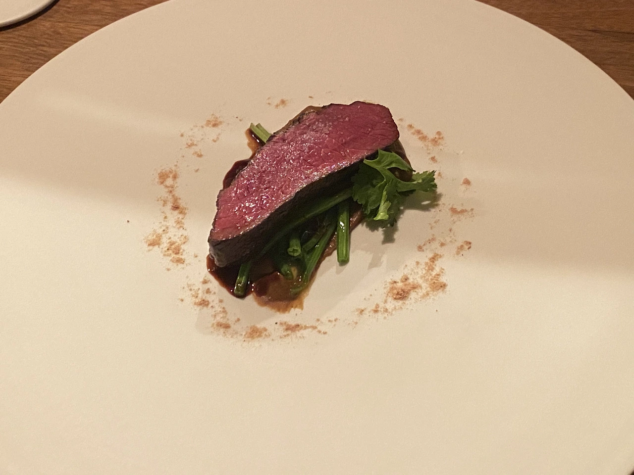 그리고 굉장히 기대했던 메인인 사슴고기. 생각해 보니 사슴고기는 먹어본 적이 없는 것 같아서 그 맛이 궁금했다. 막상 먹어보니 그냥 고기? 였다. 양고기처럼 뭔가 특색이 있는 건 아니고... 뭐랄까 좀 담백한 맛이었달까. 오히려 밑에 깔려있는 미소 소스가 굉장히 강렬하고 독특한 맛이었고, 고기 자체는 느끼하지도 않고(이틀 전 오리고기에 데인 나...) 뭐 특유의 향이 있는 것도 아니고, 그냥 때깔 매우 좋고 잘 구워진 고기였다(내 표현의 한계...) 결국 막 "되게 맛있다!" 이런 맛은 아니었던 거 같다. 애써 여러 방식으로 한점 한점 먹으며 대단한 맛을 찾아보고 싶었지만... 기대보다는 좀 무난했다고 할까.