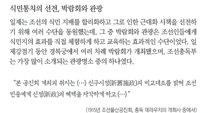 일제는 계획적이고 체계적으로 박물관을 식민지배 이데올로기를 정당화하는 정치적 도구이자 교육의 장으로 활용했다. 특히 조선총독부박물관은 1915년 열린 산업박람회인 ‘시정오년기념 조선물산공진회’의 결과물이었다. 이미 소개했듯이 서구의 국가들이 박물관을 설립하고 제국주의적인 확장의 일환으로 박람회를 개최하고 결과물로 박물관을 설립, 운영했다면 우리나라는 그들의 과정을 답습하고자 했던 일제의 식민지로 전락해 박물관을 통해서 제국주의적인 지배를 근대화라는 명목으로 받아들여야 했다.