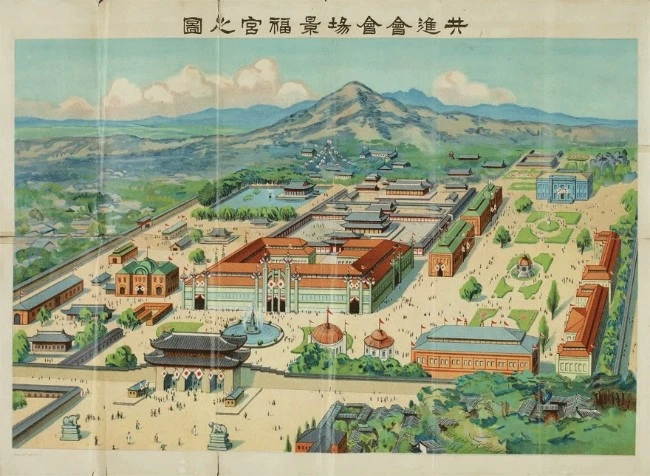 일제가 1915년 개최한 조선물산공진회장에 대한 배치도. 당시 전시관에는 미술관, 음악관, 연예관, 철도관 등이 개설. 일제는 조선물산공진회를 개최하면서 조선의 법궁이었던 경복궁 건물의 1/3을 헐어냈다.