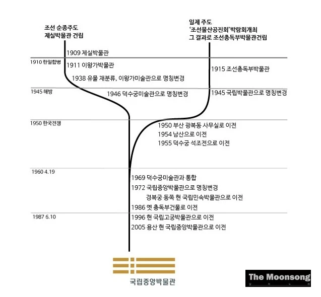 위의 연표에서 보다시피, 국립중앙박물관은 조선 순종 주도의 제실박물관에서 출발했지만 일제에서 관리한 조선총독부박물관과 나뉘어 운영되다가 전쟁과 물자부족, 경제적인 문제로 부산, 남산, 덕수궁과 경복궁을 전전하게 된다. 이후 69년에야 국립박물관으로 통합이 되었고 이후 72년 국립중앙박물관으로서 위상을 갖추고 2005년이 되어서야 현재의 자리, 용산으로 이전하게 되었다. 국립중앙박물관의 기록은 그대로 조선의 몰락과 일제의 침략, 식민지배와 해방 그리고 전쟁과 경제난 이후 산업화와 발전상까지도 보여주고 있는 것이다.