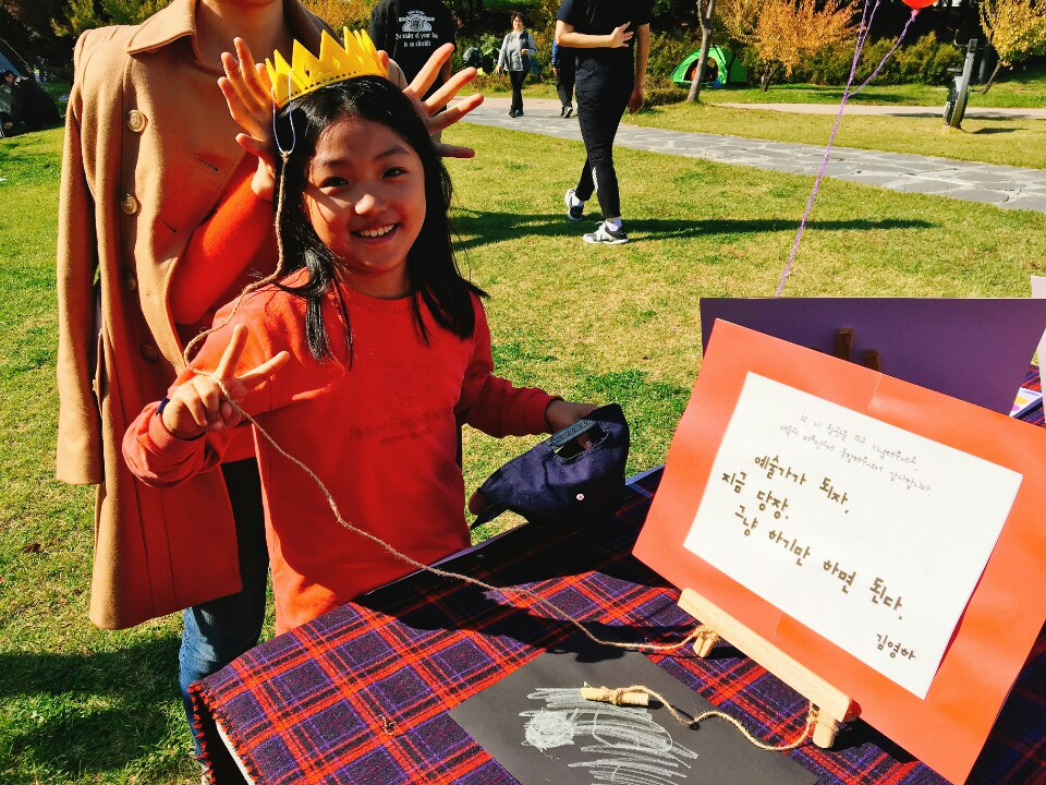 전시는 퍼포먼스 부스로 시민들이 직접 앉아 경험할 수 있는 오픈형 테이블과 의자로 준비했습니다. 예술가들의 촌철살인, 사물과 자연, 사람들을 바라보는 시각이 담긴 문장들과 그와 연관된 사물들을 배치해두었죠. 더불어 거기에 참여한 시민들이 자신들의 소감을 글과 그림으로 남길 수 있도록 준비해두고 두명의 스탭이 시민들이 참여할 수 있도록 안내하고 유도하며 축제당일 운영했습니다.