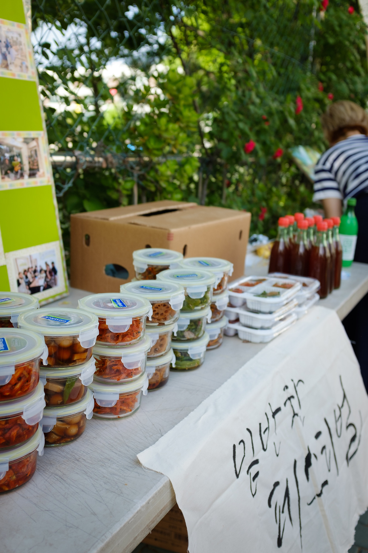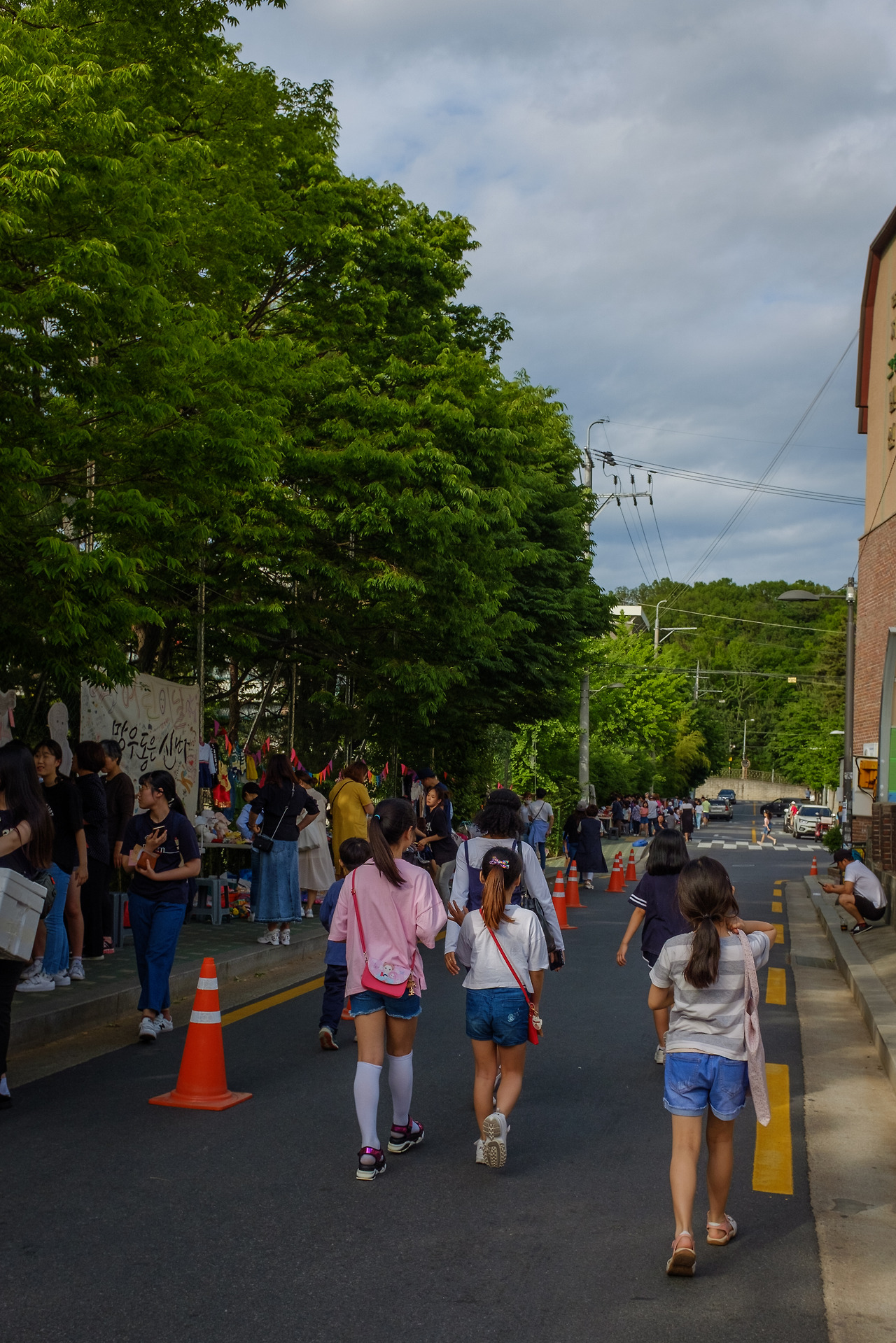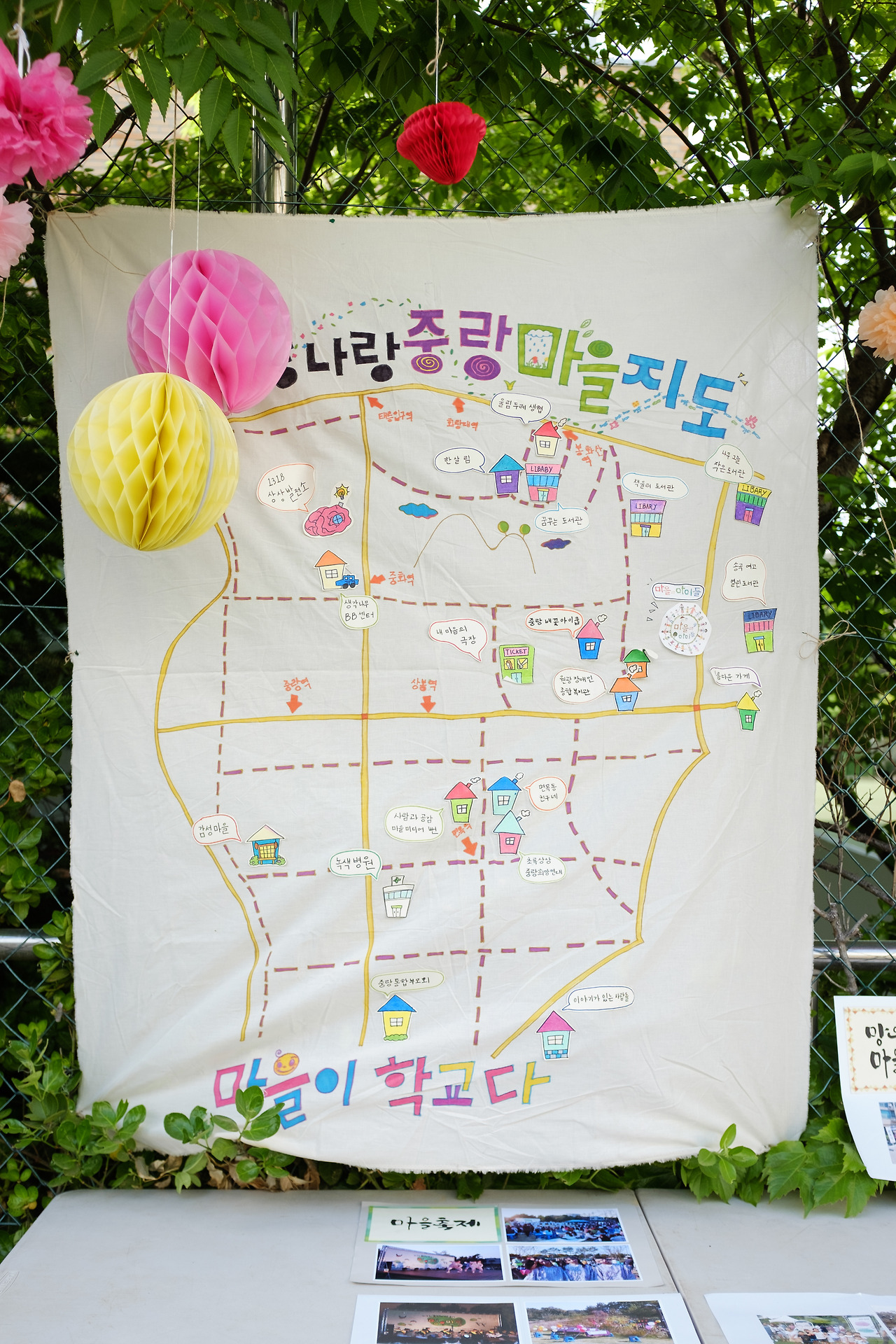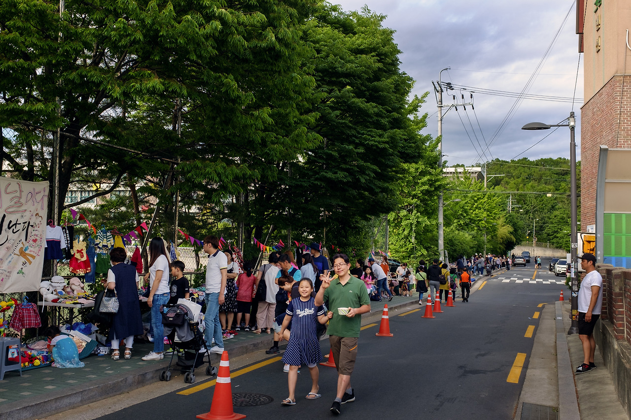 장터가 벌어지는 공간은 일자형 공용도로로 도로를 따라 늘어선 가로수가 짙푸른 녹음을 자랑하고 마침 꽃이 피어나는 그 자체로 아름다운 시기였습니다. 여기에 지역주민들의 물물교환, 벼룩시장, 마을협동조합의 반찬판매, 마을단체의 일일장터 등의 프로그램들이 주된 컨테츠였지요.