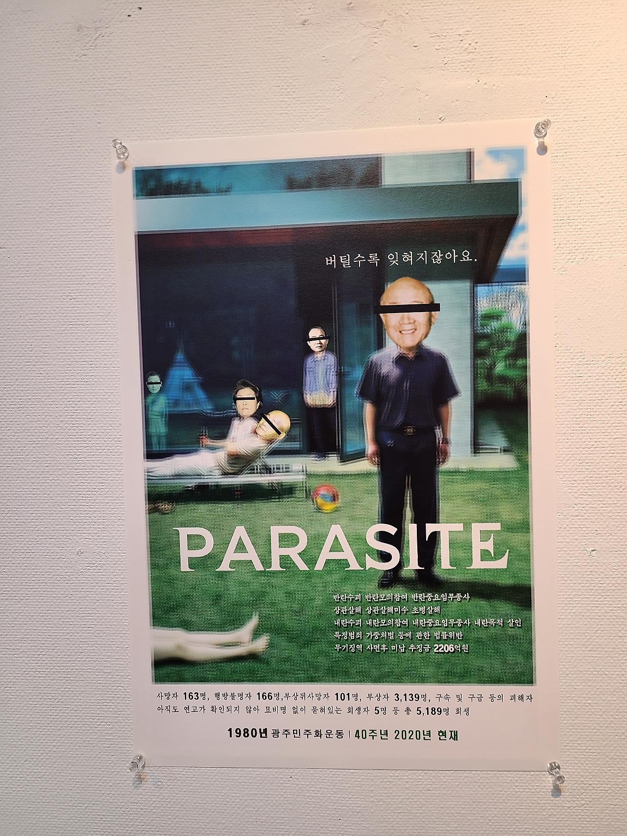 이는 40주년을 맞은 광주민주화 운동에 대한 시선을 비판적으로 암시하는 것이기도 하다. 40주년을 맞았으나 여전히 진상조사는 끝나지 않았고 진실을 증언하는 희생자들의 목소리와 이미지는 넘쳐나지만 뻔한 대중문화의 이미지처럼 냉소와 조롱의 대상이 되는 지경에 이른 현실을 대중영화포스터의 패러디로 포착하고자 했다.