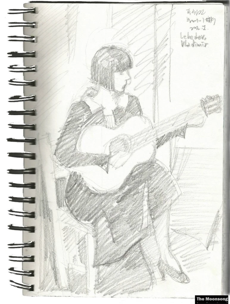 마지막으로 모사한 그림은 기타를 치는 여자를 그린 유화였다. 그림을 보자마자 시베리아 횡단열차에서 들었던 기타선율을 떠올리고 있었다. 저녁이 되면 쿠페칸 안에 등이 꺼지고 방송이 나왔는데 종종 기타를 반주로 한 노래나 기타연주곡들이 있었다. 기타선율과 덜커덩거리는 기차소리, 창밖의 지평선이 아스라한 드넓은 대지가 어우러져 묘한 여운을 주곤 했었다. 그림 속의 여자는 방안에 앉아있었지만 창문 너머 풍경을 상상하게 했다. 기타에 열중하는 모습이 투박하면서도 거친 질감의 붓자국으로 그리고 부드러우면서도 묵직한 색채로 존재감을 드러내고 있었다. 풍파를 겪고서도 담담한, 깊은 사색속에서도 서정을 놓지 않는 일상. 돌이켜보면 그것이 내가 느낀 러시아의 정서였던 것 같다. 아마도 혁명과 전쟁 그리고 냉전과 구소련의 붕괴를 거치고 난 러시아가 자아내는 분위기였던 것 같다.