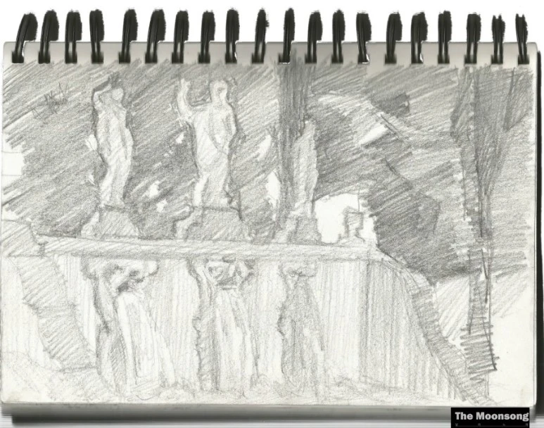 그림 속에는 달마저도 희미한 어두운 밤과 더없이 화창하게 빛나는 낮이 공존한다. 왕궁의 지붕을 뒤로 하고 날뛰는 말발굽을 피해 달아나는 그림자와 우아한 조각상 아래 물줄기가 시원하게 쏟아지는 녹음.