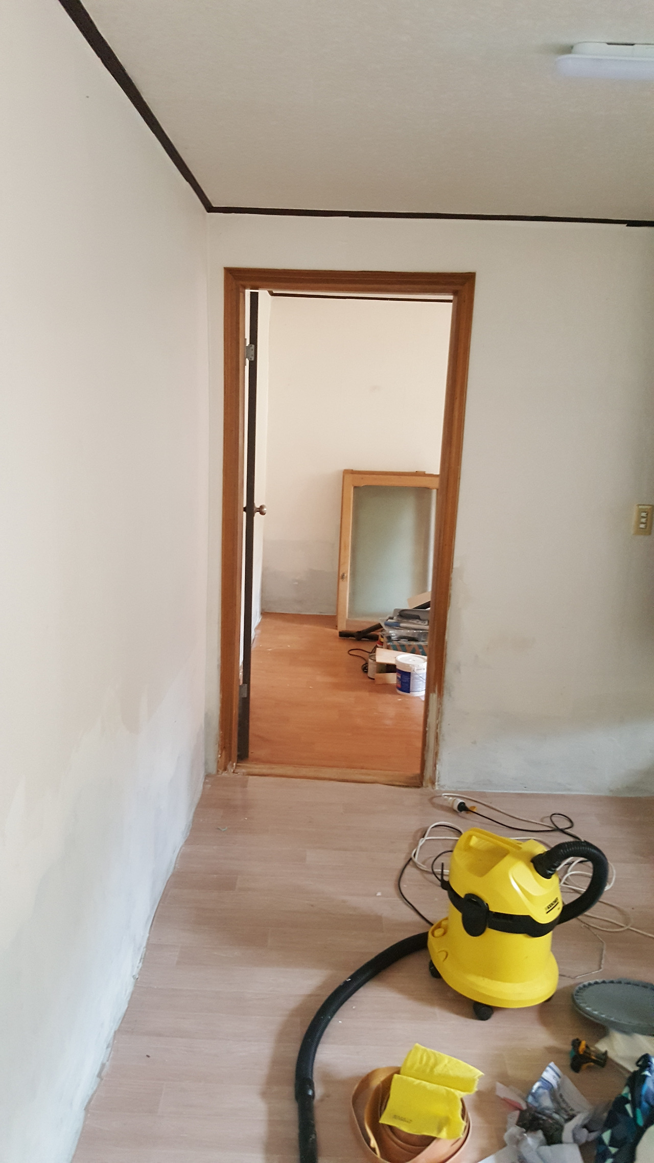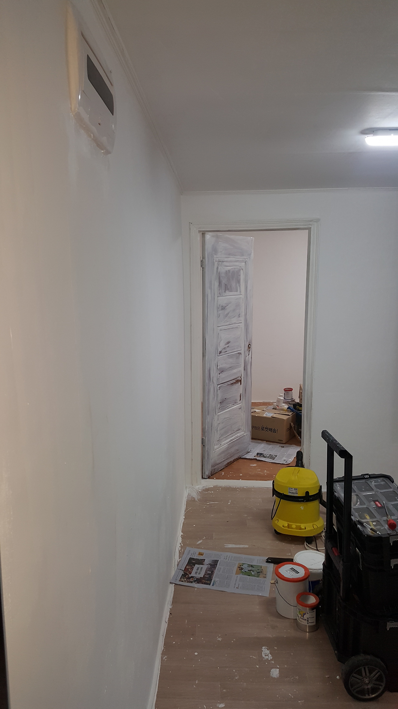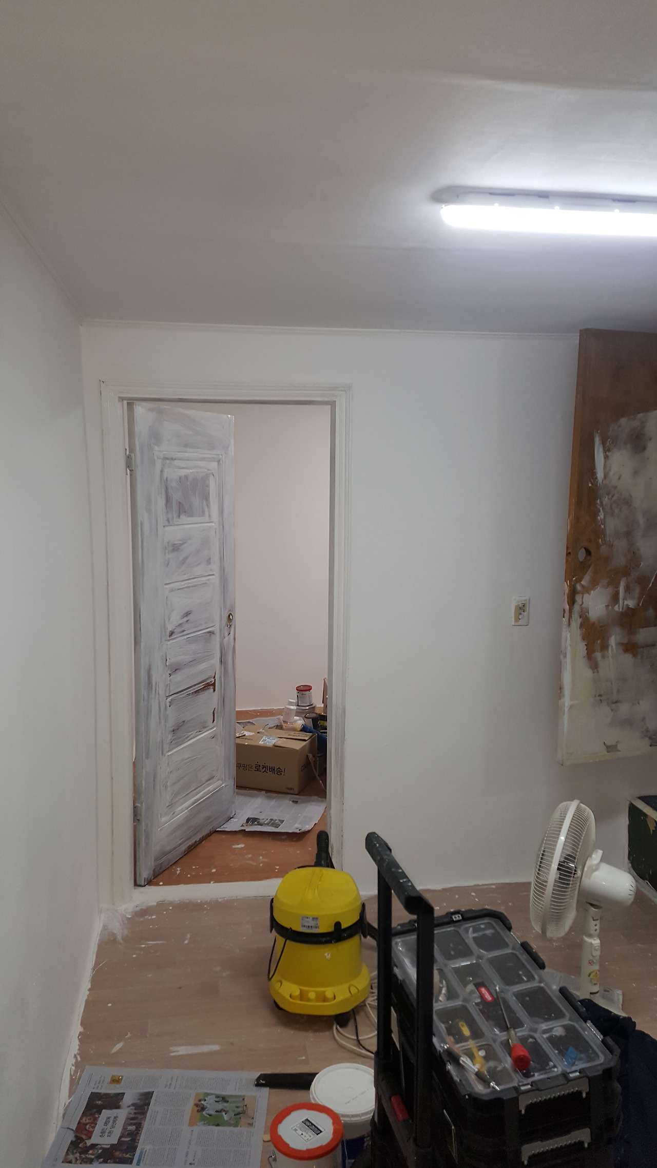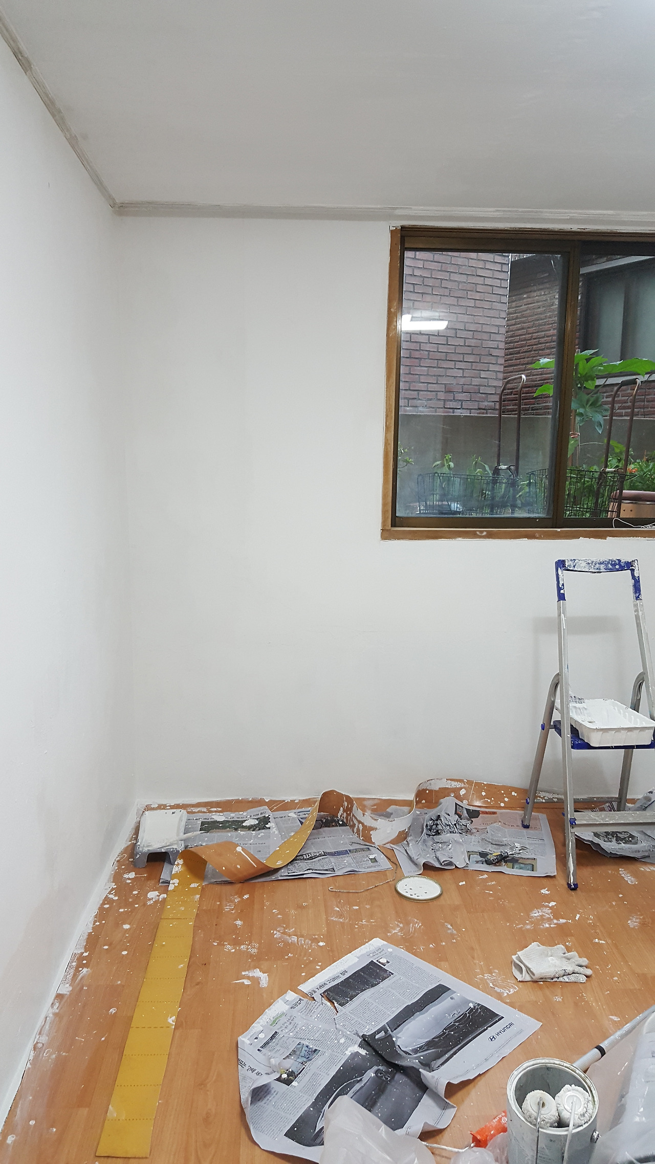 곰팡이방지 및 결로방지 기본작업 후, 본격적인 페인팅. 무광 친환경 화이트 페인트로 도배지, 콘크리트, 몰딩까지도 발랐다. 기존의 벽지, 그 위에 덧바른 벽지, 그 위에 덧댄 여러가지 지저분한 흔적들이 페인트와 함께 사라졌다. 물론 사진과 달리 실제로 자세히 보면 그 흔적이 희미하게 남아있지만. 흰 벽은, 지층의 공간을 훨씬 환하고 넓게 만들어주었다. 제일 단순하면서도 큰 효과를 줄 수 있는 방법임을 몸소 체험한 흰 색 페인팅.