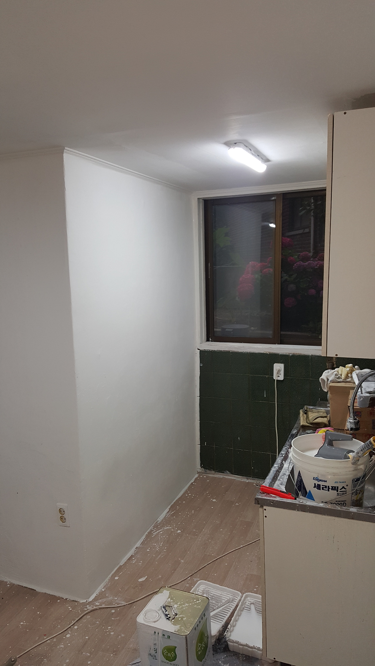 7월에 시작한 인테리어는 9월이 된 지금 이사를 하고도 완전히 끝나지 않았지만 다시 돌아보니 정신이 아득해질만큼 힘들었던 순간. 아마도 이사가 끝나고도 틈틈이 스크래치 난 곳을 덧칠해주어야할 거라는 조언에 죽어도 싫다고 궁시렁거렸지만 결국은 한 번 더 마무리 페인트칠을 해줘야할 듯 하다.