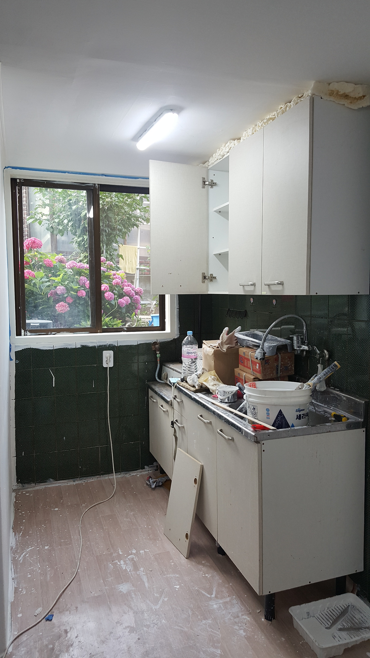 그리고 부엌의 싱크대 윗면과 상부장뒤의 들뜬 부분, 옆면 부분을 우레탄폼으로 채워 벌레들이 드나들 수 없도록 막아두었다. 한여름 찌는 듯한 더위 속 수국을 보며 시작한 작업을 벌레소리 들리는 가을에 되돌아본다.