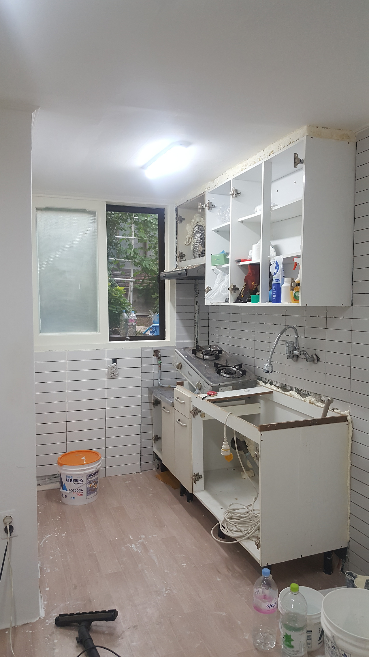씽크대 밑작업: 기존에 있던 한없이 가볍고 저렴한, 휘어져있던 싱크대상판을 떼어내고 상파용 원목과 싱크볼을 주문. 싱크대를 올리기 전에 뒷부분의 빈공간을 우레탄폼으로 메꿨다.