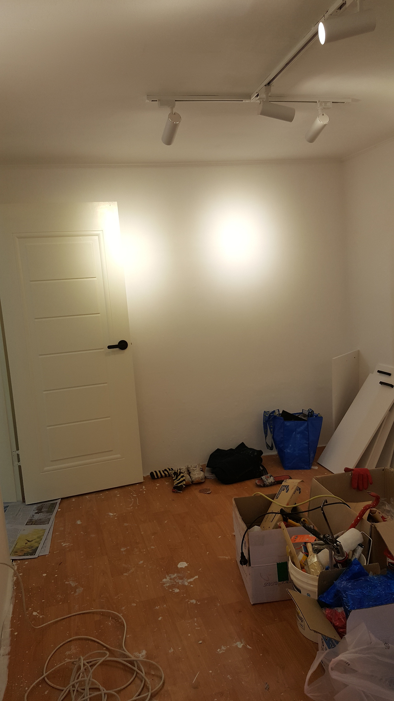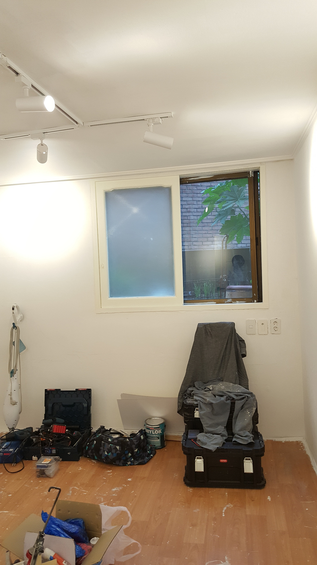 질릴 정도로 지난한 과정에 마르기를 기다리며 싱크대문짝부터 새 시트로 교체해서 달고 천장에 레일을 달고 부엌및 거실 그리고 침실과 작업실이 될 방에 조명을 설치했다. led로 확산형과 집중형 그리고 주광색과 형광색 섞어서 구입. 가구로 채울 곳과 작업을 할 곳을 상상하며 빈 공간을 우선 조명으로 채우며 마음이 한결 가벼워졌다. 따뜻하게 번지는 노오란 빛으로 내 마음에 불을 밝혔다.