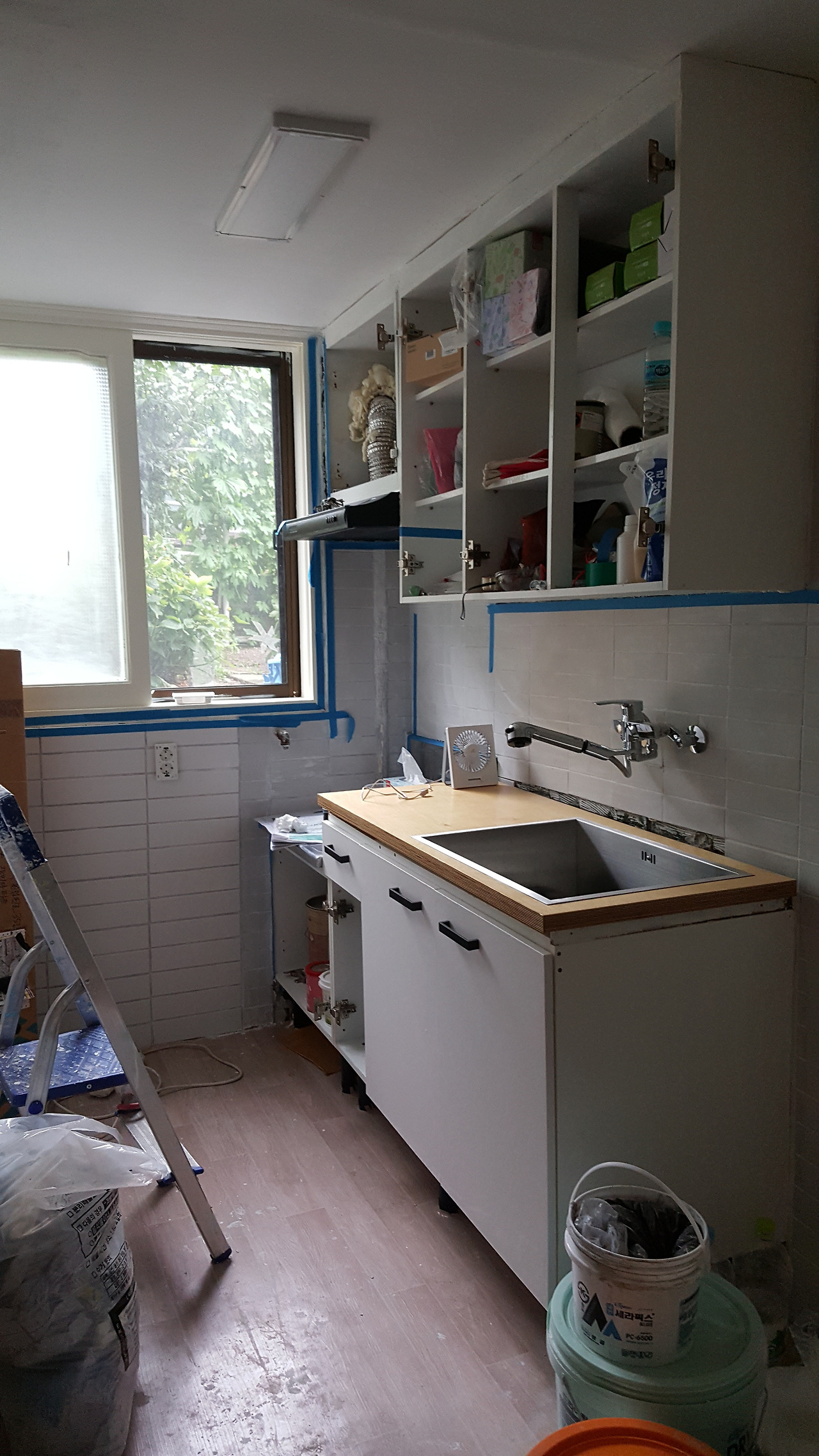 올해는 50일이 넘는 긴 장마였던 터라 부엌과 화장실타일이 더디게 말랐고 오래된 수전을 교체하고 재설치하는 과정에서 자꾸만 세는 곳때문에 타일이 마르지 못한 채 흠뻑 젖어버렸다. 타일이 들뜨고 세라픽스가 손으로도 떼어질 정도가 되어버려 결국은 작업이 길어졌다. 타일을 다시 흰색 시멘트로 강하게 접착시키고 수전도 오래된 접촉부분에 메꿈테이프를 써서 조이기를 여러 차례.