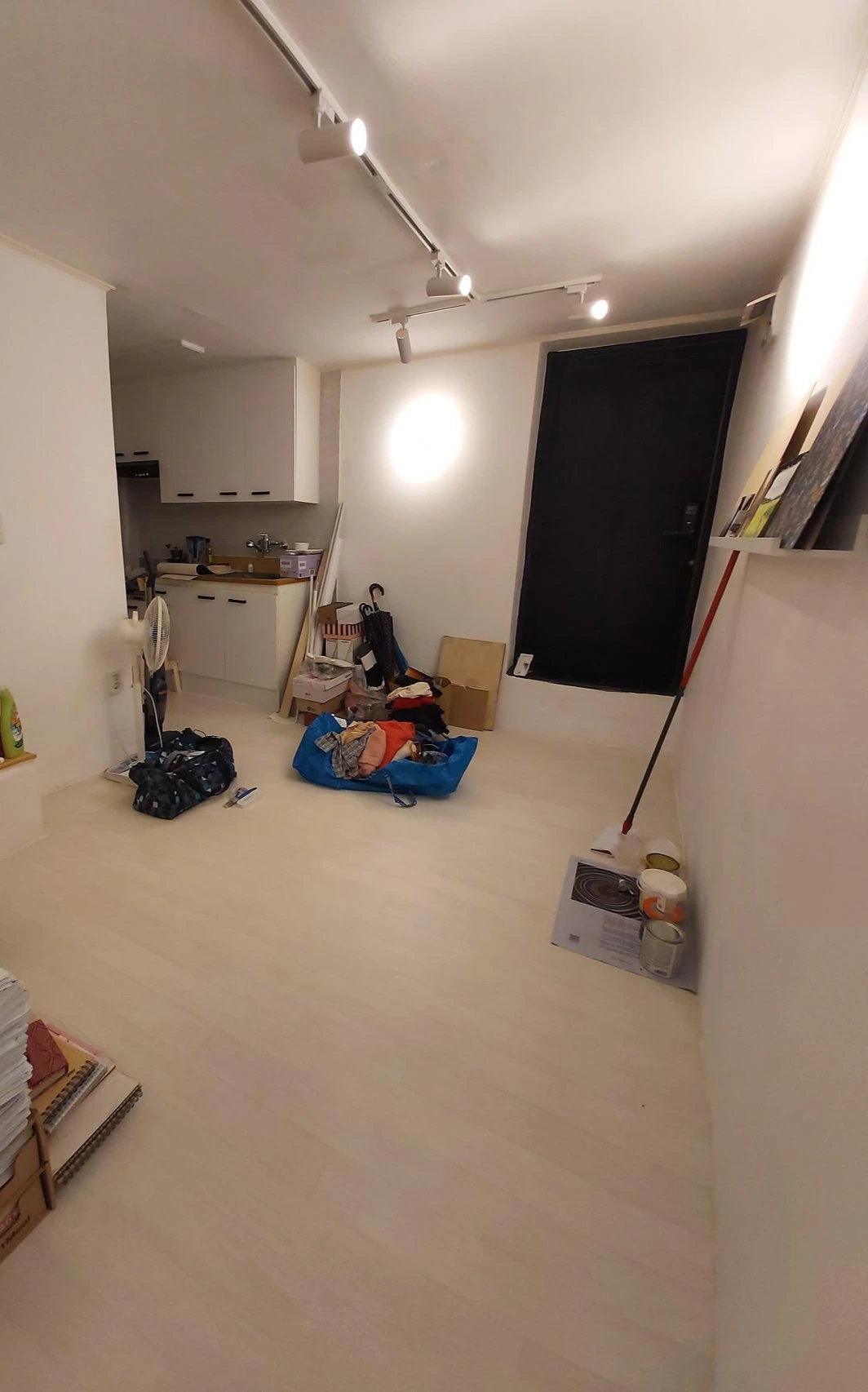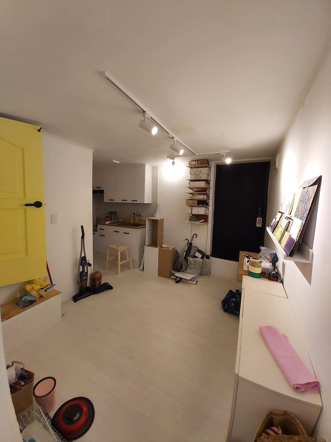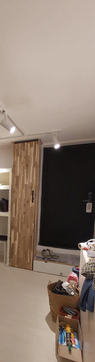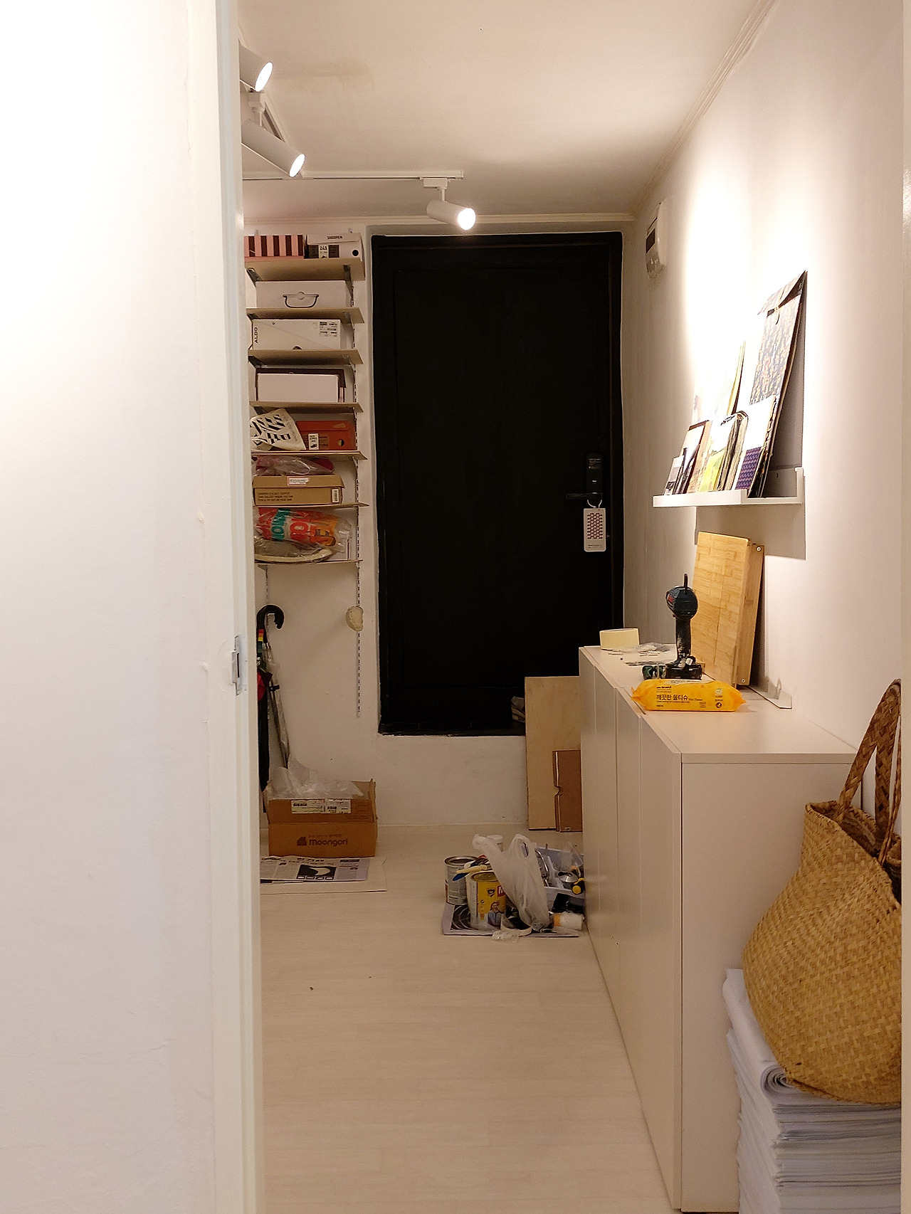 생활하며 느꼈던 필요와 앞으로의 생활을 위한 고려를 적어보고 목재로 찬넬선반과 계단으로 쓸 선반을 만들기로 했다. 찬넬선반은 천장끝에서 바닥끝까지 갖고 있는 신발들을 수납하고 남는 공간에는 생활잡화를 수납할 수 있도록 수납력을 최대화할 수 있었다. 무엇보다 프레임을 사서 벽에 고정시키고 얇은 판재를 얹어주면 그만. 간단히 만들 수 있고 편리하게 생활에 맞게 수납의 높낮이도 조절할 수 있을 터였다. 찬넬선반을 만들고 목재로 가벽을 세워 자석여닫이 경첩으로 간단한 문을 만들기로 마음먹었다.천장부터 신발을 채우고 아래에는 부츠, 우산, 신발관련물품들과 잡화 등을 넣어 보관할 예정이었다. 계단은 친구의 조언에 따라 무게를 지탱할 수 있는 프레임을 세운뒤 나무를 얹고 역시 아래를 가릴 수 있도록 가벼운 문을 만들어주기로 했다. 인테리어를 하고 남은 물품들, 앞으로도 필요할 잡화들을 넣을 수납공간도 확보할 수 있을 터였다.