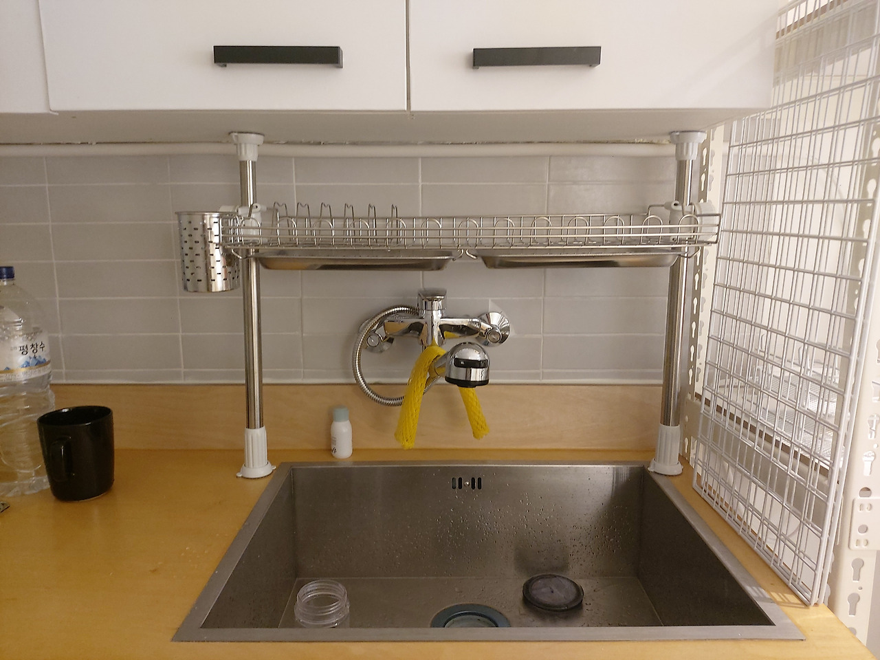 다음으론 설거지를 위해서 식기건조대를 주문했다. 최대한 조리대의 면적을 확보하기 위해서 싱크볼에서 설거지후 바로 얹어 말릴 수 있는 것으로 그리고 높낮이를 조절할 수 있는 것으로 골랐다. 어차피 1인가구라 그릇이 많지도 않을 테니. 그러나 역시 비좁은 규격을 벗어난 싱크대와 상부장의 크기 탓에 식기건조대중에서도 가장 작은 것을 골라야했고 그마저도 수도꼭지의 위치때문에 더욱 좁아졌다. 탐탁치 않았지만 어쩔 수 없기도 했고 무엇보다 실제로 요리를 해보고 설거지도 해보고 주방을 써보면서 확인해봐야하는 것들이라 일단은 그대로 두기로 했다.