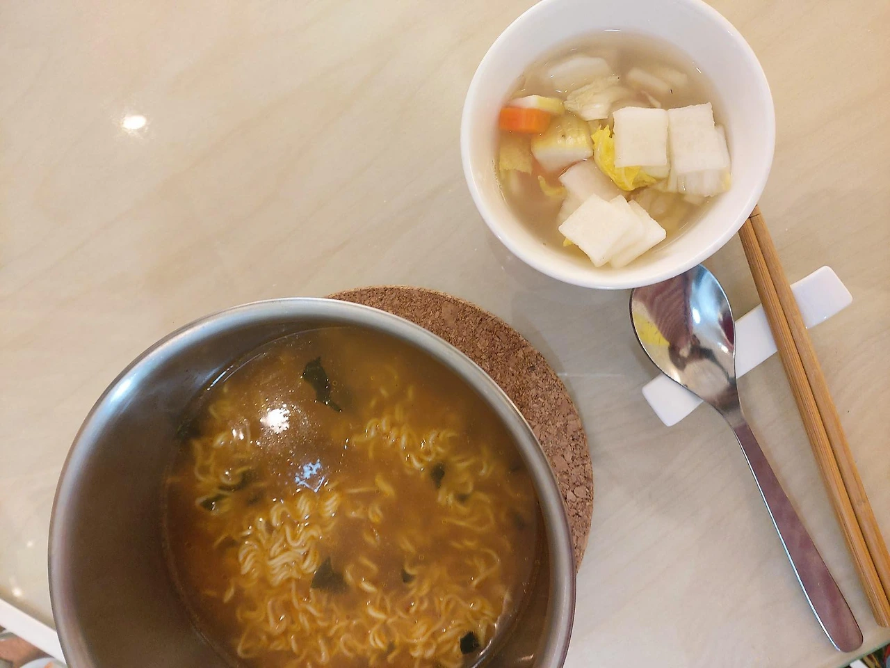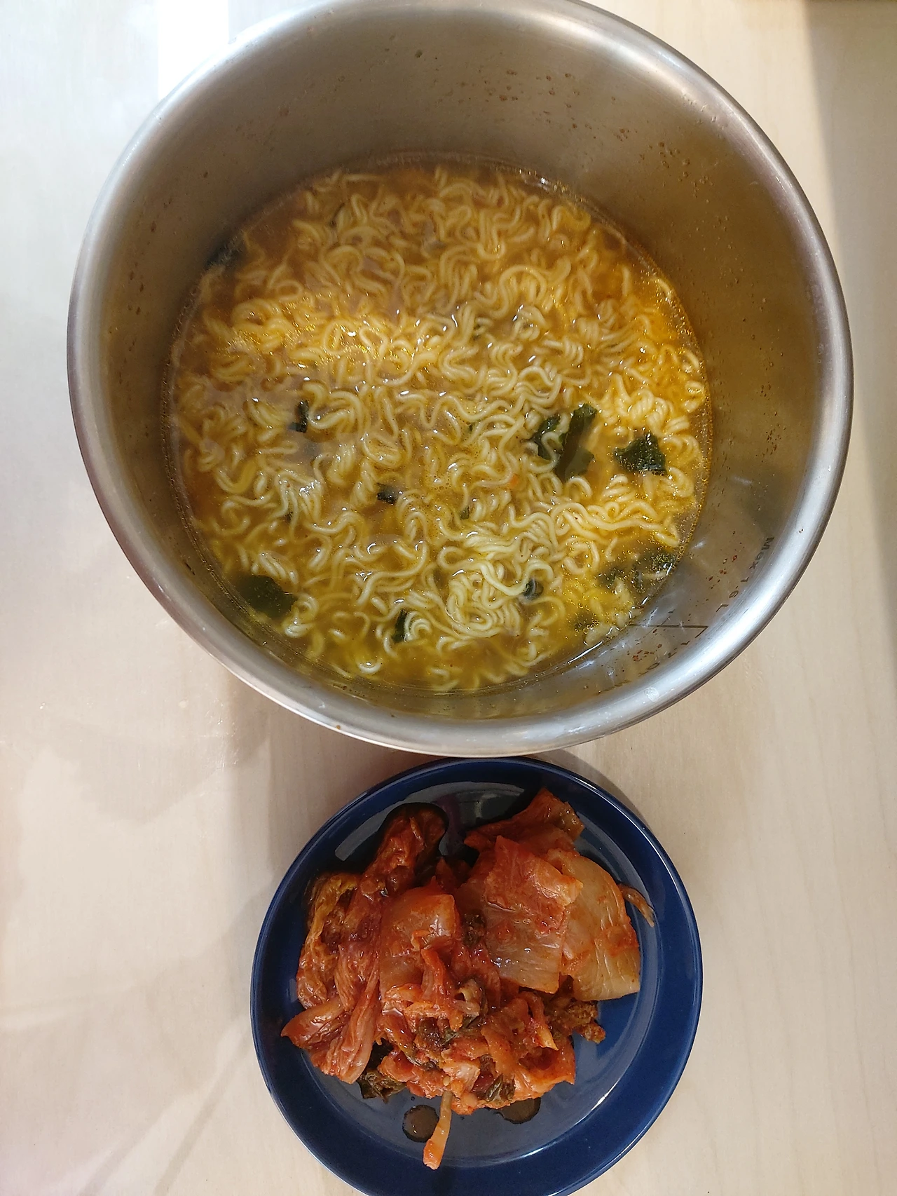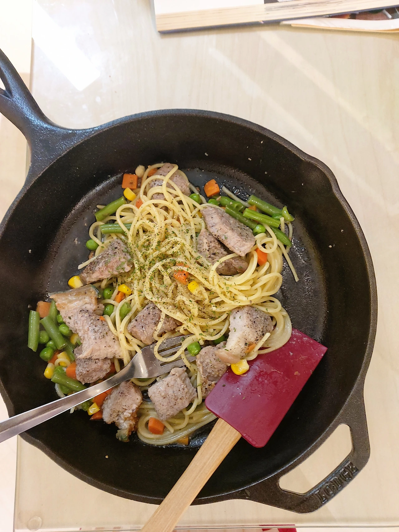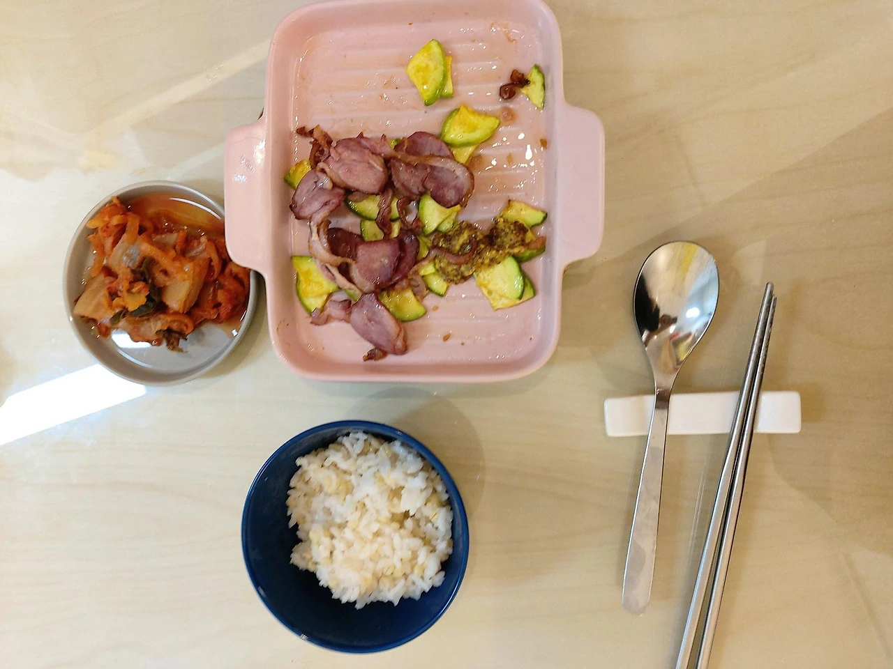 남은 훈제오리고기는 토스트와 함께 조금은 든든한 아침으로도 애호박과 함께 저녁 주반찬으로도 알뜰히 먹었다. 레토르트 우동에는 대파와 양파를 듬뿍 넣어서 라면에도 대파와 양파, 냉동야채를 추가. 냉동야채와 냉장고에서 쉬어가던 물김치를 파스타에 더했다.