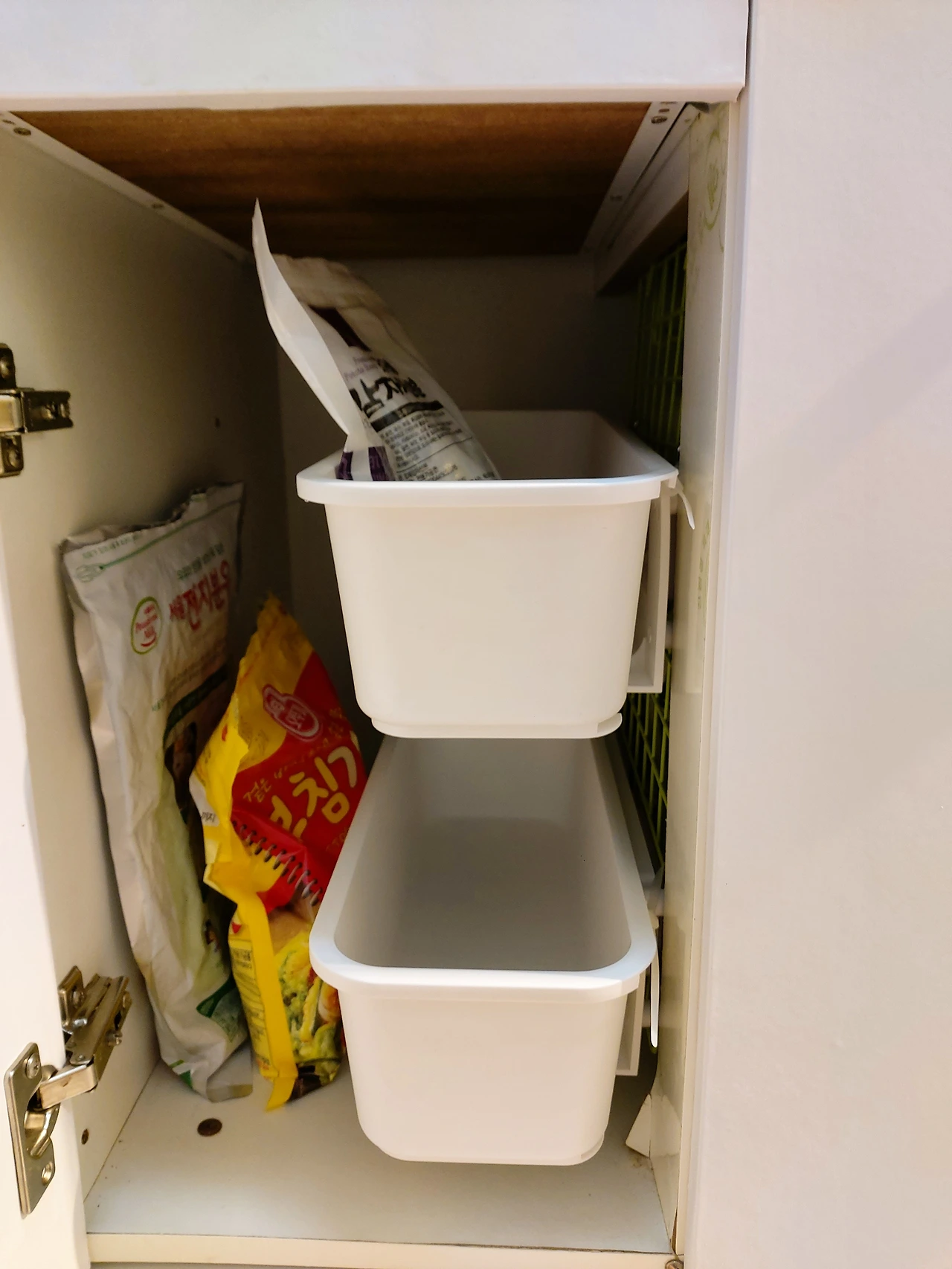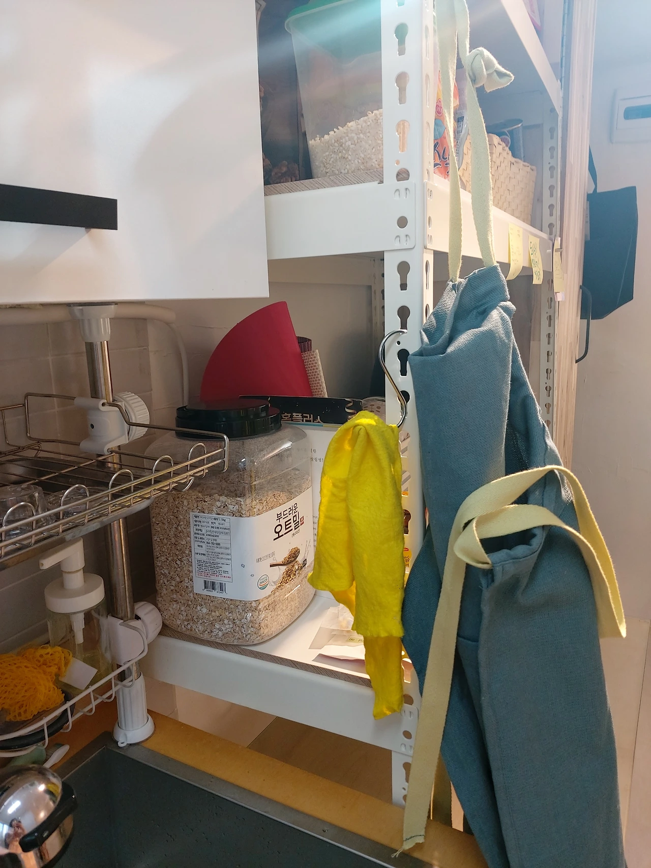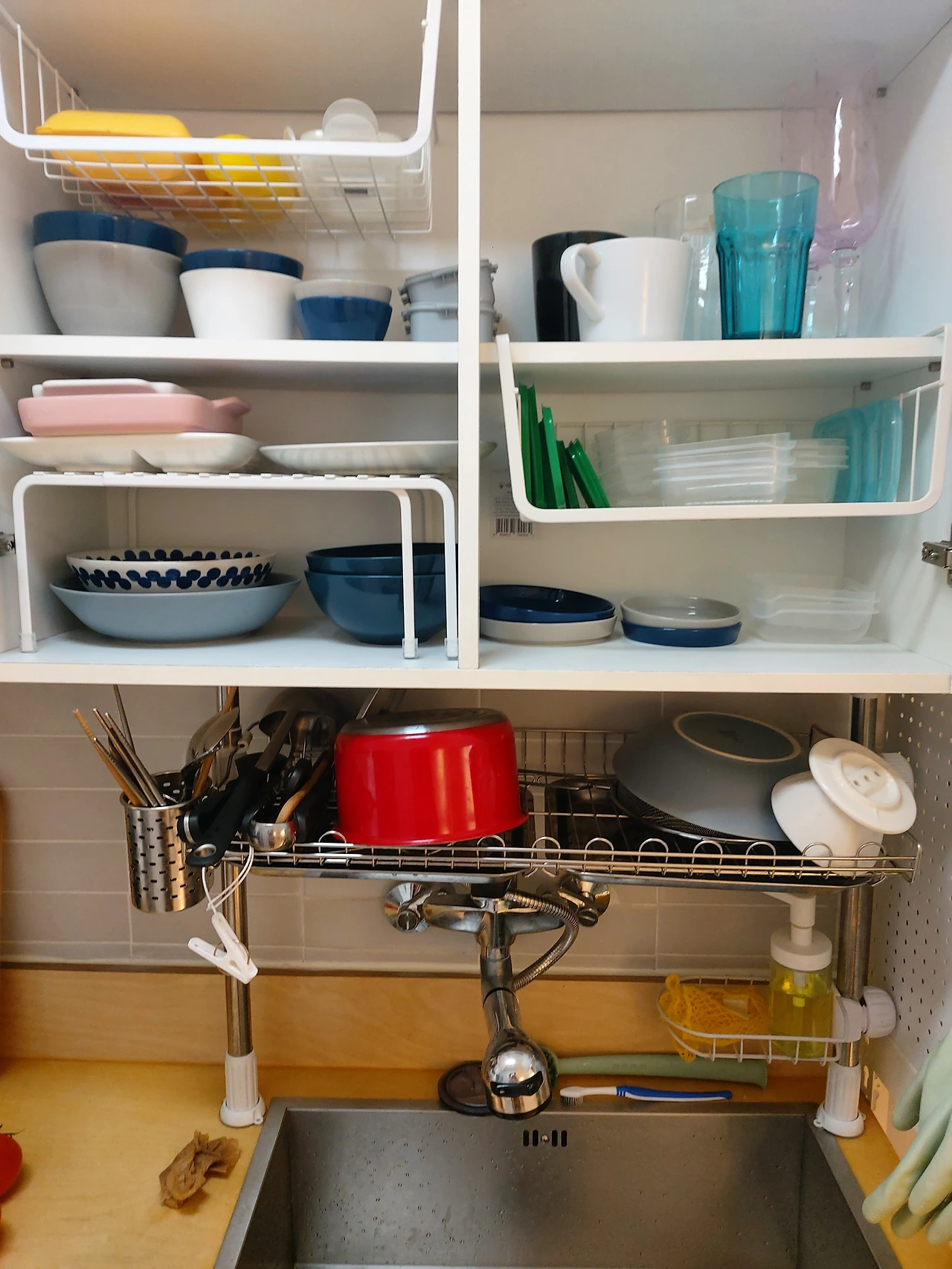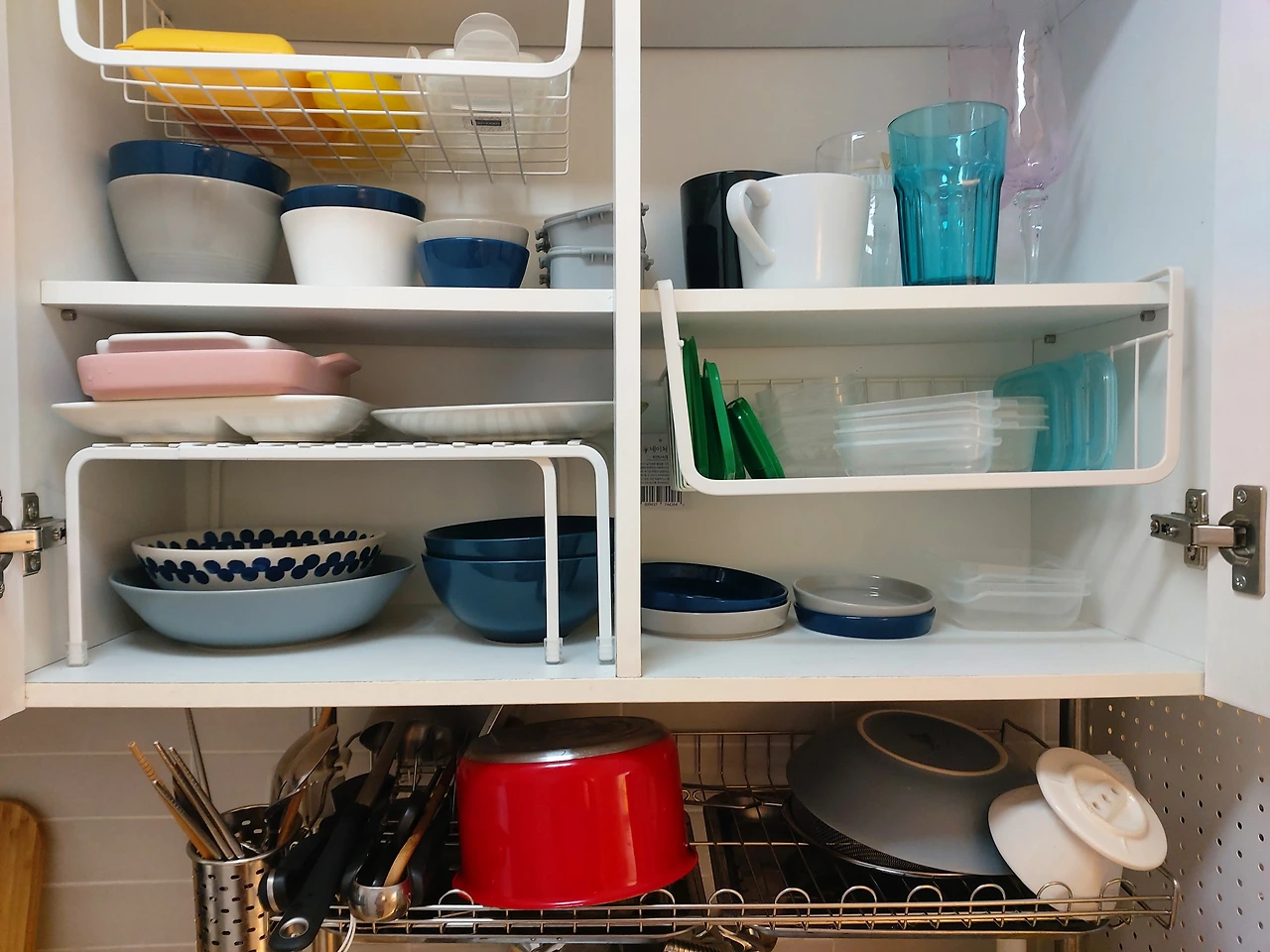 키친타월 걸이를 쓰기 편한 위치에 고정하고 조리대는 최대한 비워둘 수 있게 정리. 몇 달간 일부러 상부장과 하부장도 그래도 쓰면서 내부 공간을 활용하기 가장 좋은 형태가 무엇인지 고민해보았다. 상부장은 식기와 저장용기들. 식사를 위한 식기들과 보관이나 도시락통으로 쓰는 용기들을 포개 두거나 같이 두는 건 한눈에 구분하고 그때그때 꺼내서 쓰기가 어렵게 만들었다. 상부장도 하부장도 기성품이 아닌지라 공간의 높이와 너비에 맞게 바스켓 형태의 수납용 걸이 선반을 구입해서 용도별로 구분해서 정리. 하부장은 레토르트나 캔과 같은 저장식품들과 부엌용 청소도구들 그리고 정수기 필터와 같은 소모품들을 정리해두었다. 하부장도 인덕션 아래처럼 슬라이딩형 수납장으로 만들고 싶었지만 역시 기성 제품이 아닌지라 크기가 안 맞아 슬라이딩형 수납 선반들로 정리해두었다.