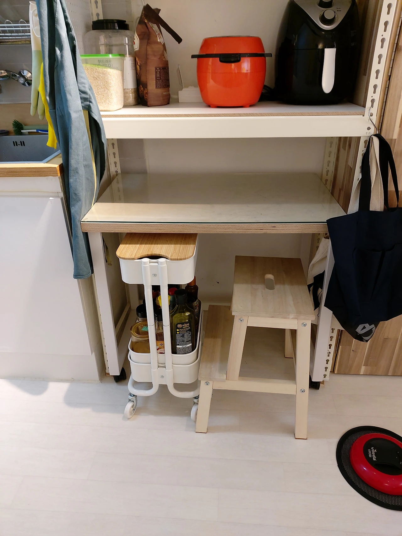 조미료와 식재료들을 편안하게 쓸 수 있게 해 준 카트를 좀 더 쓰기 편안하게 바꾸었다. 3단을 2단으로 정리하고 아랫단에 큰 조미료들을 윗단에는 작은 조미료들을 넣어두고 뚜껑 겸 도마로 쓸 수 있는 플레이트를 닫아 원래 의도대로 테이블 아래로 넣었다. 공간이 좀 더 정돈된 느낌.