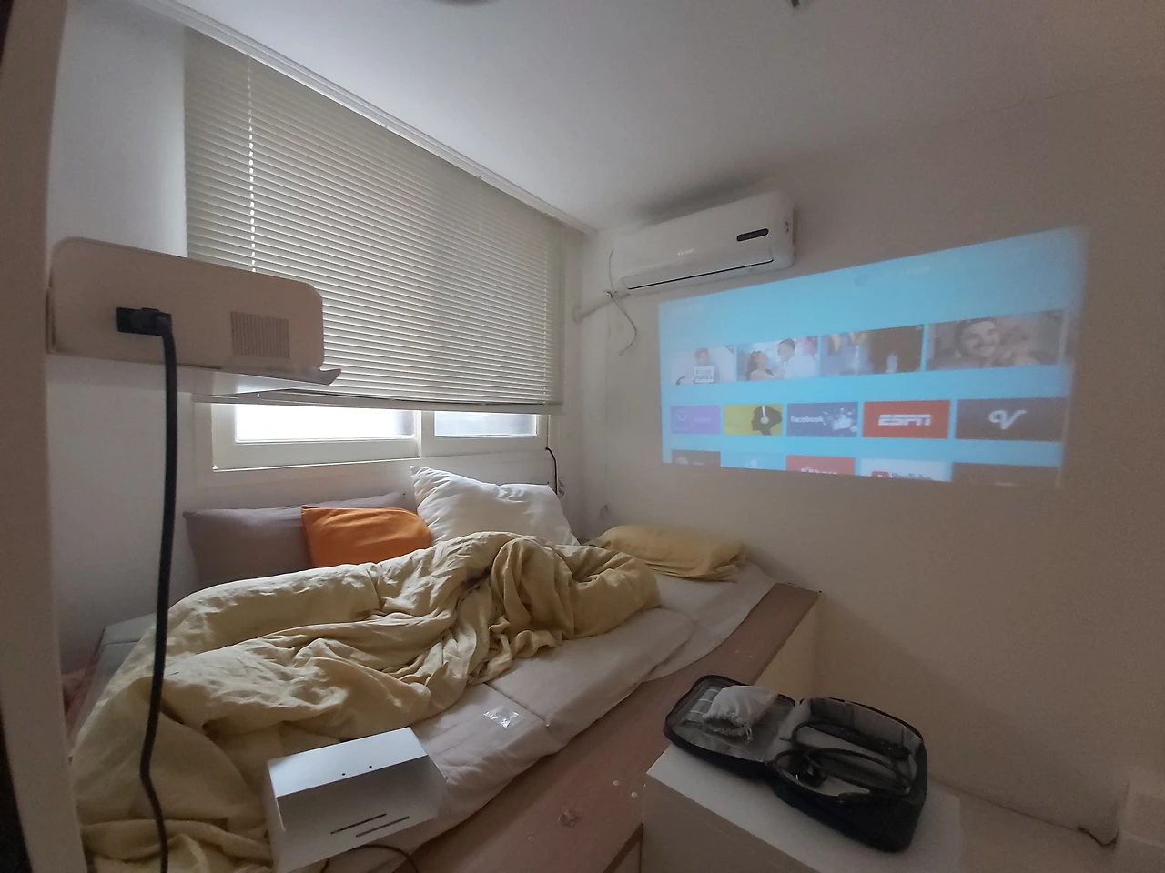 큰 맘먹고 빔프로젝터를 구입했다. 요즘 자기 전 매일 요가를 하는 습관을 들이려고 노력 중인데 요가를 할 때마다 작은 핸드폰 화면을 보는 게 답답했다. 영화나 영상도 노트북 화면으로 보는 것보다는 스크린에서 보고 싶었다. 저렴하지만 성능은 나쁘지 않다는 평가를 받은 중국산 프로젝터 몇 개를 저울질해보고 블루투스 기능과 와이파이 기능이 탑재된 것으로 주문하고 몇 주를 써보았다. 처음에는 이동형 서랍장 위에 두고 쓰다가 위치를 정해줄 필요를 느꼈다. 내친김에 타공판용 선반과 수납함을 주문해 프로젝터도 노트북도 제 자리를 찾아주었다. 드라이어도 핸드폰 충전도 노트북 충전과 빔프로젝터 연결도 모두 콘센트가 필요한 탓에 멀티탭도 추가해서 자리를 잡아주었다.