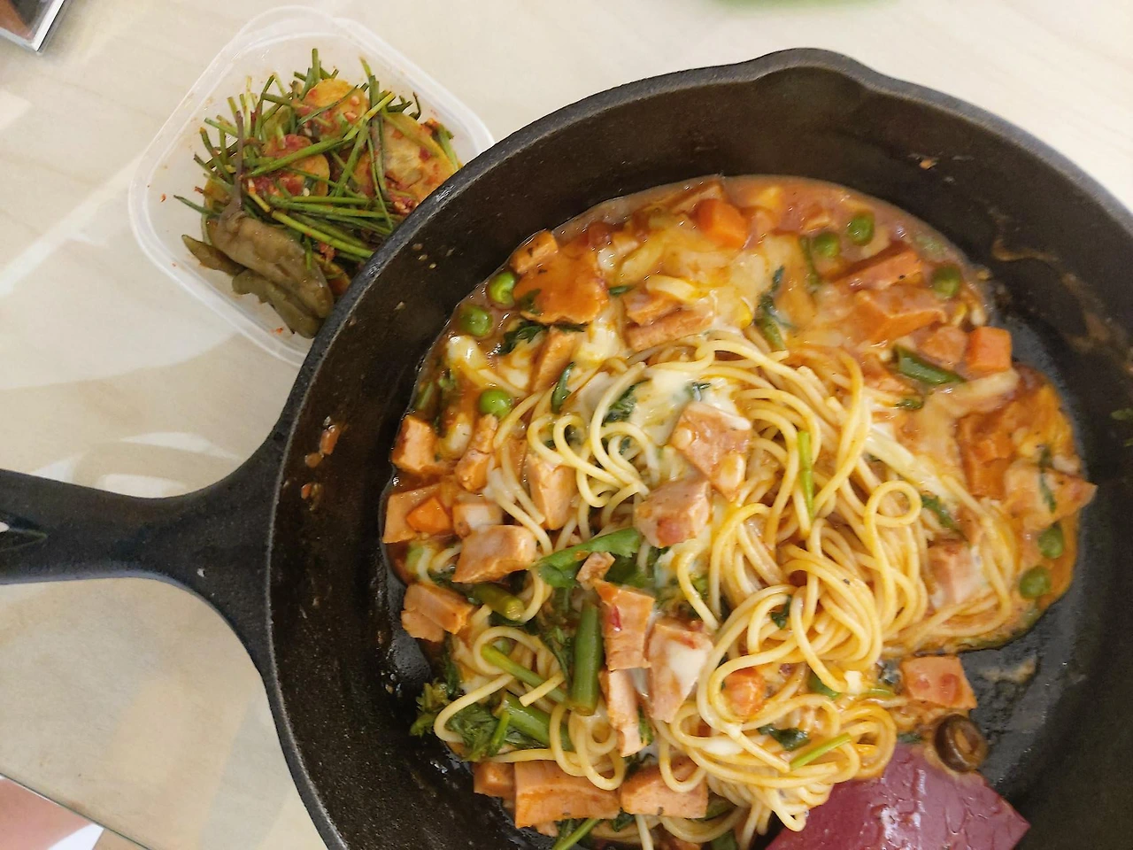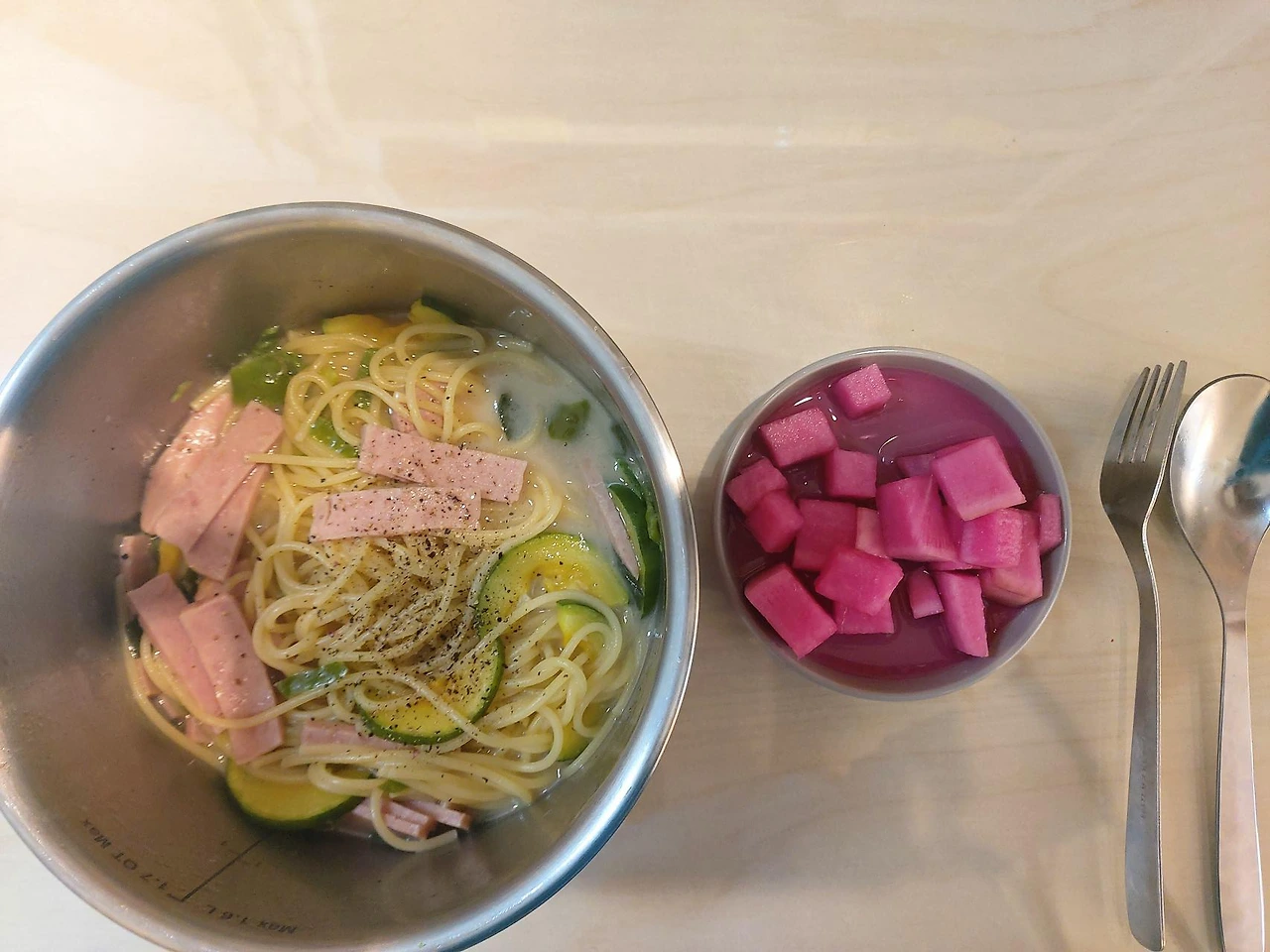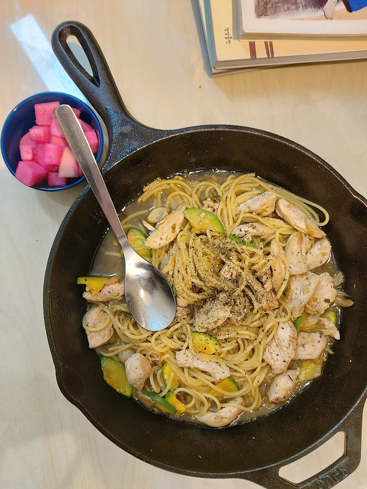 이어서 무피클, 냉동야채, 스팸, 레토르트곰탕, 김, 다시마까지. 가지고 있던 식재료들을 다른 요리에 곁들이기도 하고 새로운 식재료를 더해서 새로운 요리를 만들기도 하면서 냉장고 파먹기와 곰탕국물로 만든 파스타와 같은 새로운 레시피도 시도해보기도.