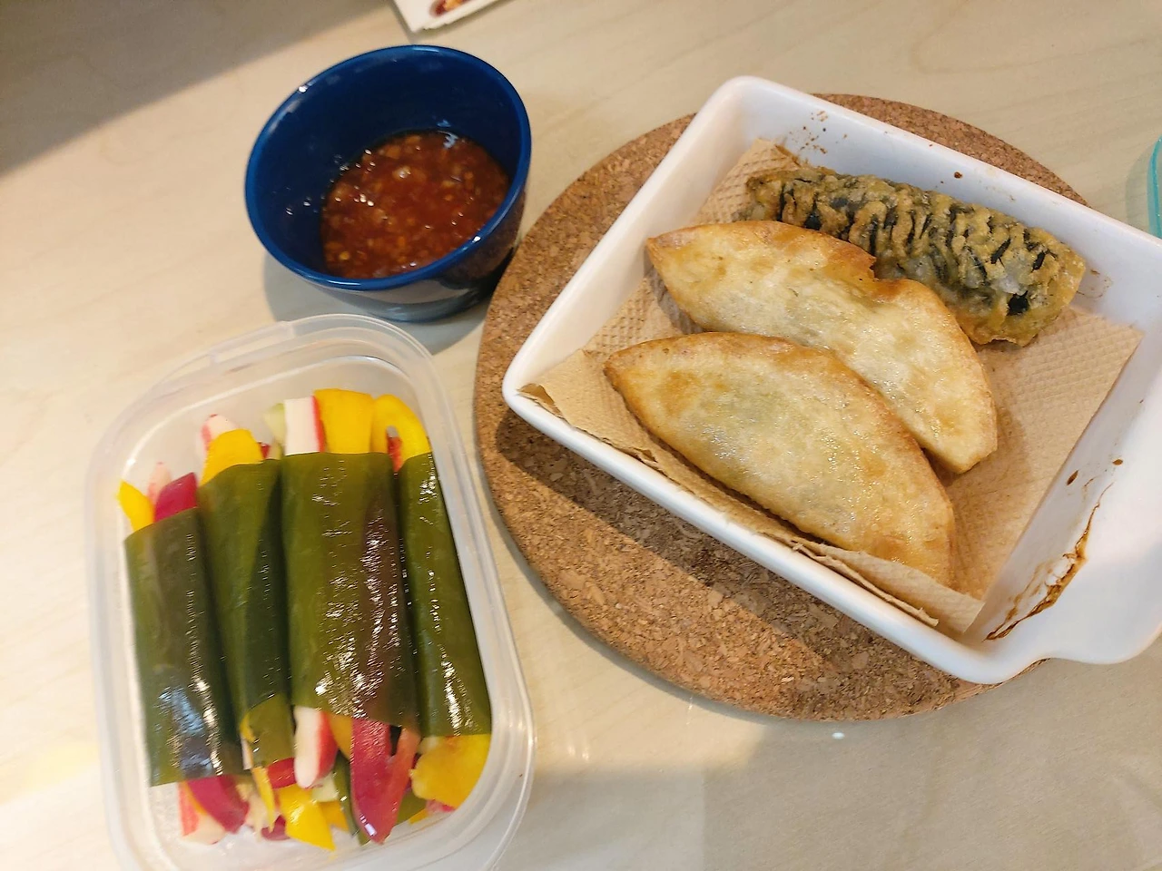 발을 질질 끌며 간신히 집에 도착하니 발바닥이 터질 것 같이 아파서 그대로 침대에 누워버렸던 날. 자극적인 음식이 먹고 싶어 떡볶이 세트를 시켰다. 침대에 베드트레이를 펼치고 넷플릭스를 켜고 최대한 게으름을 즐기며 먹다보니 절반도 먹지 못했는데 배가 불렀다. 소분해서 냉동실과 냉장실에 보관해둔 떢복이와 순대, 튀김은 다음날부터 채소나 다른 간단한 요리들과 함께 든든한 한끼가 되어 며칠을 먹을 수 있었다.