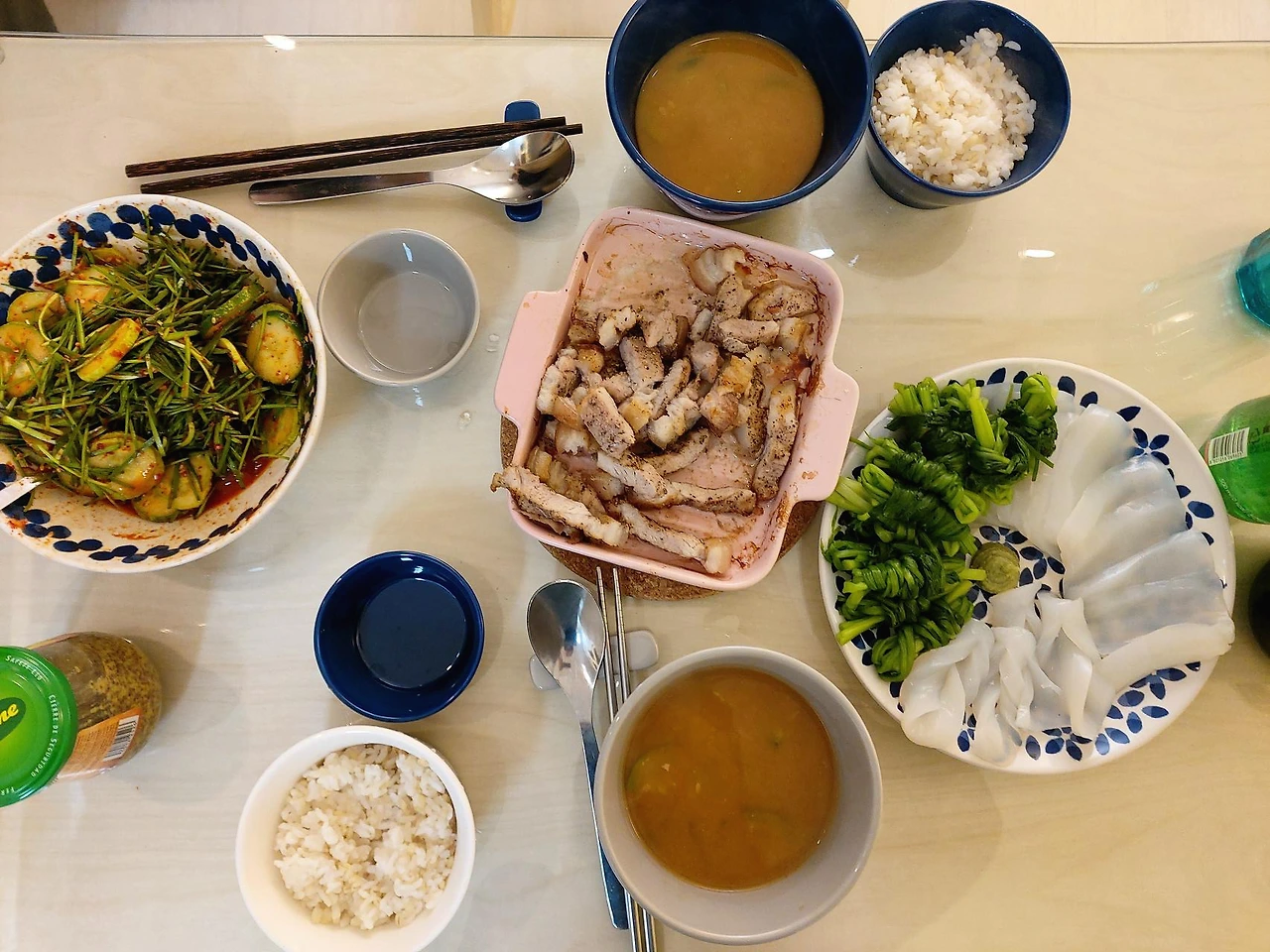 부추오이무침, 미나리강회, 쑥갓 등 잎채소들이 본격적으로 나오고 저렴해지는 시기라 고기나 면 요리에 곁들여서 혹은 밑반찬으로 함께 했다. 특유의 향와 더불어 상큼하게 맛의 밸런스도 맞춰주고 포만감도 더해준다.