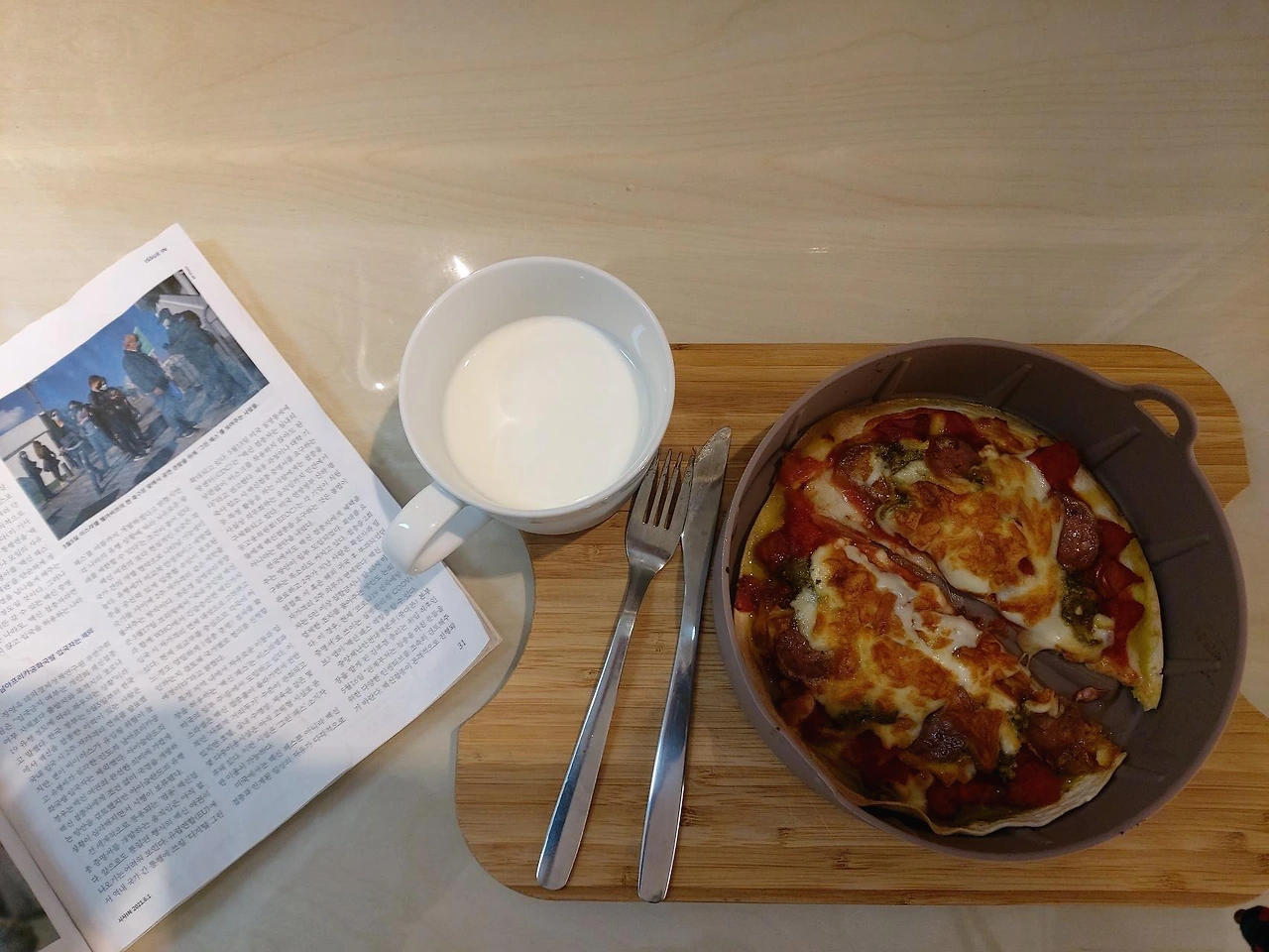 그렇게 얻은 몇 개의 간단하면서도 맛있는 레시피들. 또르띠야 피자. 쉽게 이탈리안 피자의 맛을 즐길 수 있다. 또르띠야에 토마토과육이 든 이탈리안 토마토캔, 모짜렐라치즈를 더하면. 혹 바질페스토가 있다면 거의 완벽. 닭가슴살 갈비양념구이. 퍽퍽한 닭가슴살이 싫다면 양념에 재워 하루이틀 후에 에어프라이기에 버터와 함께 굽는 것으로 풍부한 육즙에 부드러운 살코기를 맛볼 수 있다. 주먹밥. 멸치호두볶음이 어쩐지 손이 안가고 까끌거리는 맛이 영 걸린다면 주먹밥으로 만들면 훨씬 편하고 맛있게 먹을 수 있다. 목살양념구이. 양념에 재운 목살을 에어프라이어에 굽는 것만으로 돼지갈비구이와 똑같은 맛을 즐길 수 있다.