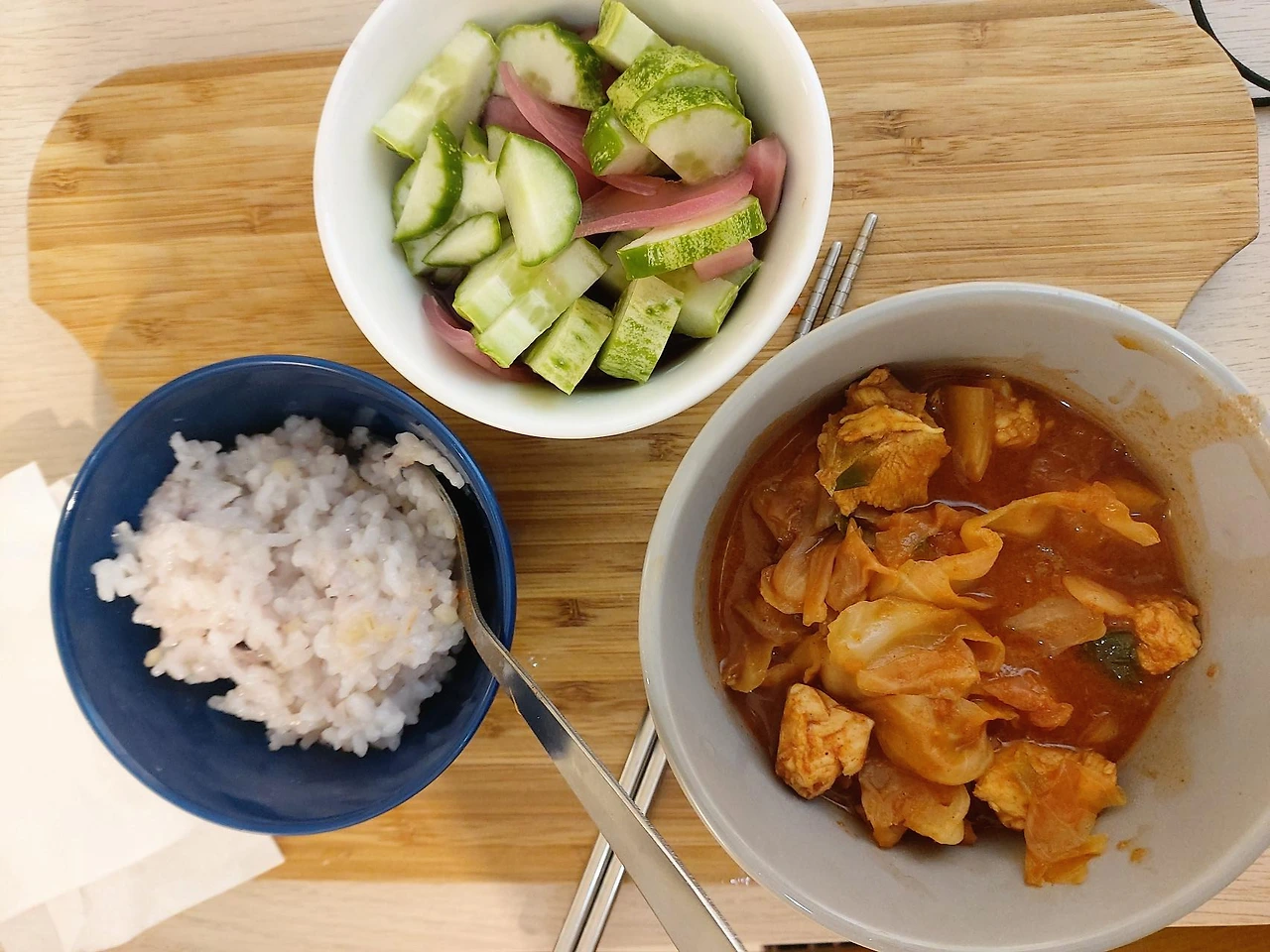 몰아치듯 바빴던 일정을 일단락하고 체력적으로 좀 정신을 차리고 나서는, 집에서도 다시 요리를 조금씩 시작했다. 도시락도 꾸준히 싸야했기에 식단이 지루해지는 게 싫어서 새로운 시도를 해보기도 했다. 집근처 도서관에서 빌린 요리책들을 넘겨보다가 내가 갖고 있는 재료를 활용할 수 있을 듯 하면 응용해보는 방식으로 조금씩 변화를 줬다. 다시 사진을 천천히 살펴보며 돌이켜보니 주로 제철재료들을 최대한 활용하되 간단하고 빠른 요리(라고 하기엔 민망하리만치 간단한 요리)들이다.