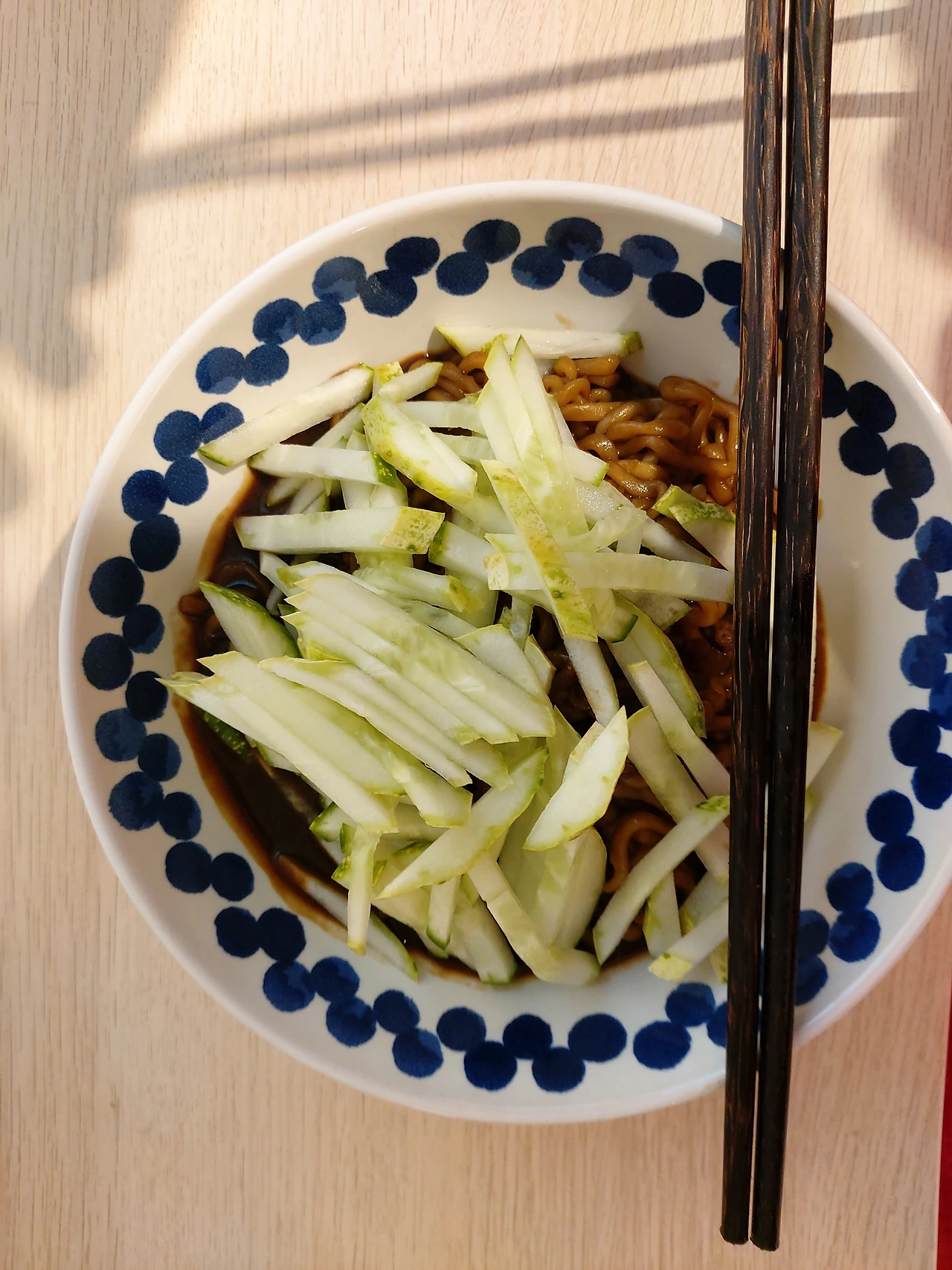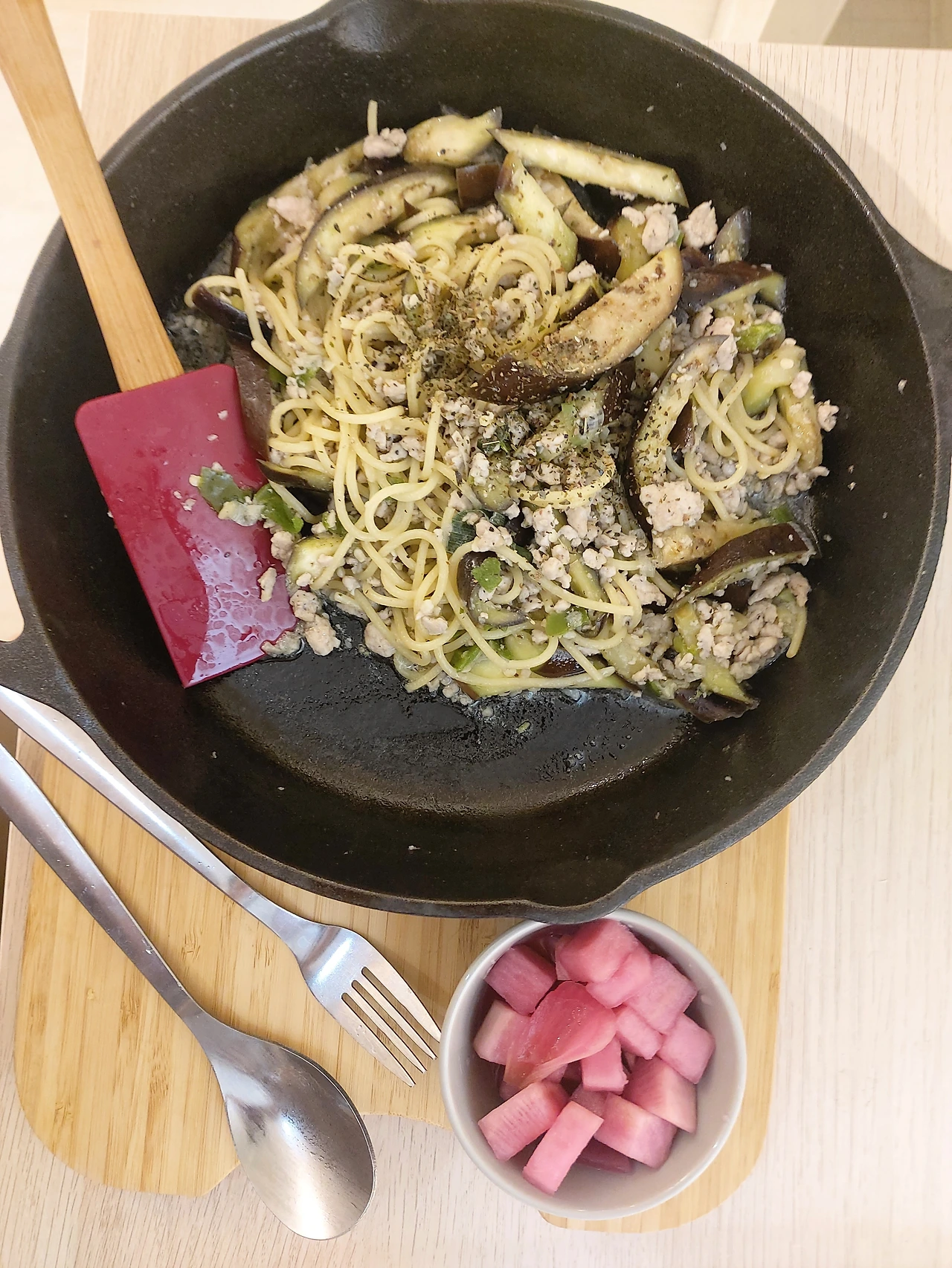 제철 햇감자로 웨지감자. 소금과 후추, 허브로 기본적인 맛을 내고 나서도 위에 치즈를 얹거나 칠리 소스, 꿀 같은 걸 더해서 먹으면 맛을 또 다양하게 즐길 수 있다. 의외로 든든한 한끼. 커피와도 잘 어울려 여러 차례 점심으로 먹었다. 오이, 가지, 양배추 등 마트에 가면 그 주에 가장 저렴한 야채들을 살 수 있었다. 더위때문에도 신선한 야채의 아삭함과 시원함이 자꾸만 생각이 나기도 했고. 역시나 간단한 면! 면! 면! 요리라고 하기에도 옹색한 짜파게티, 비빔면, 파스타, 라면에 산더미같이 야채를 쌓고 참기름과 통깨, 추가로 마무리. 남은 자투리 야채들로 토마토소스캔과 함께 에그인헬. 스팸햄과 함께 코올슬로. 기성피클에 더해 산뜻한 반찬으로.
