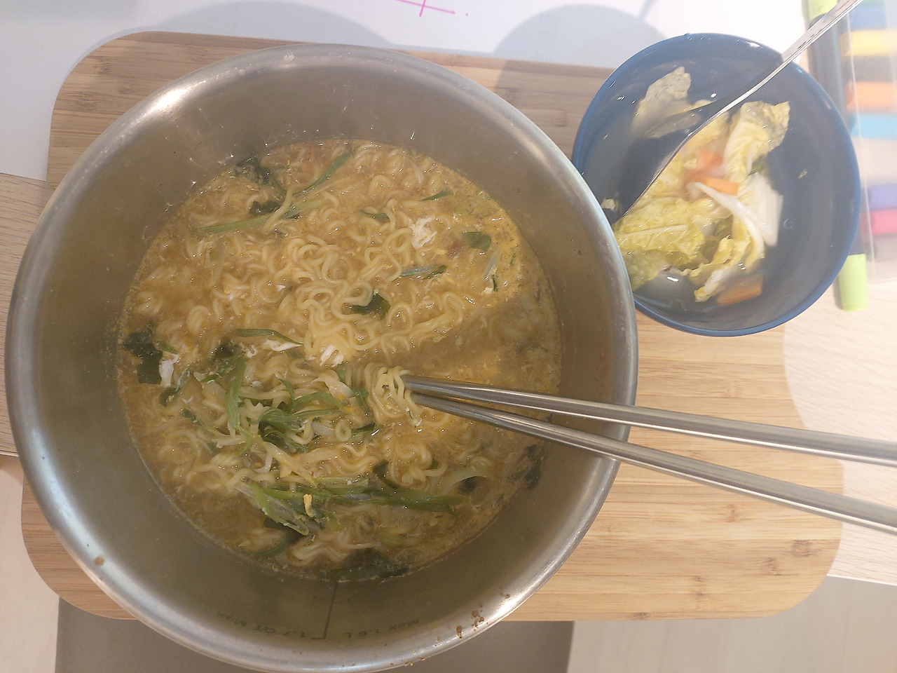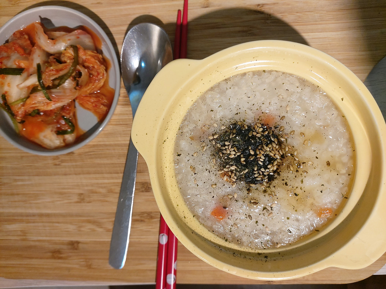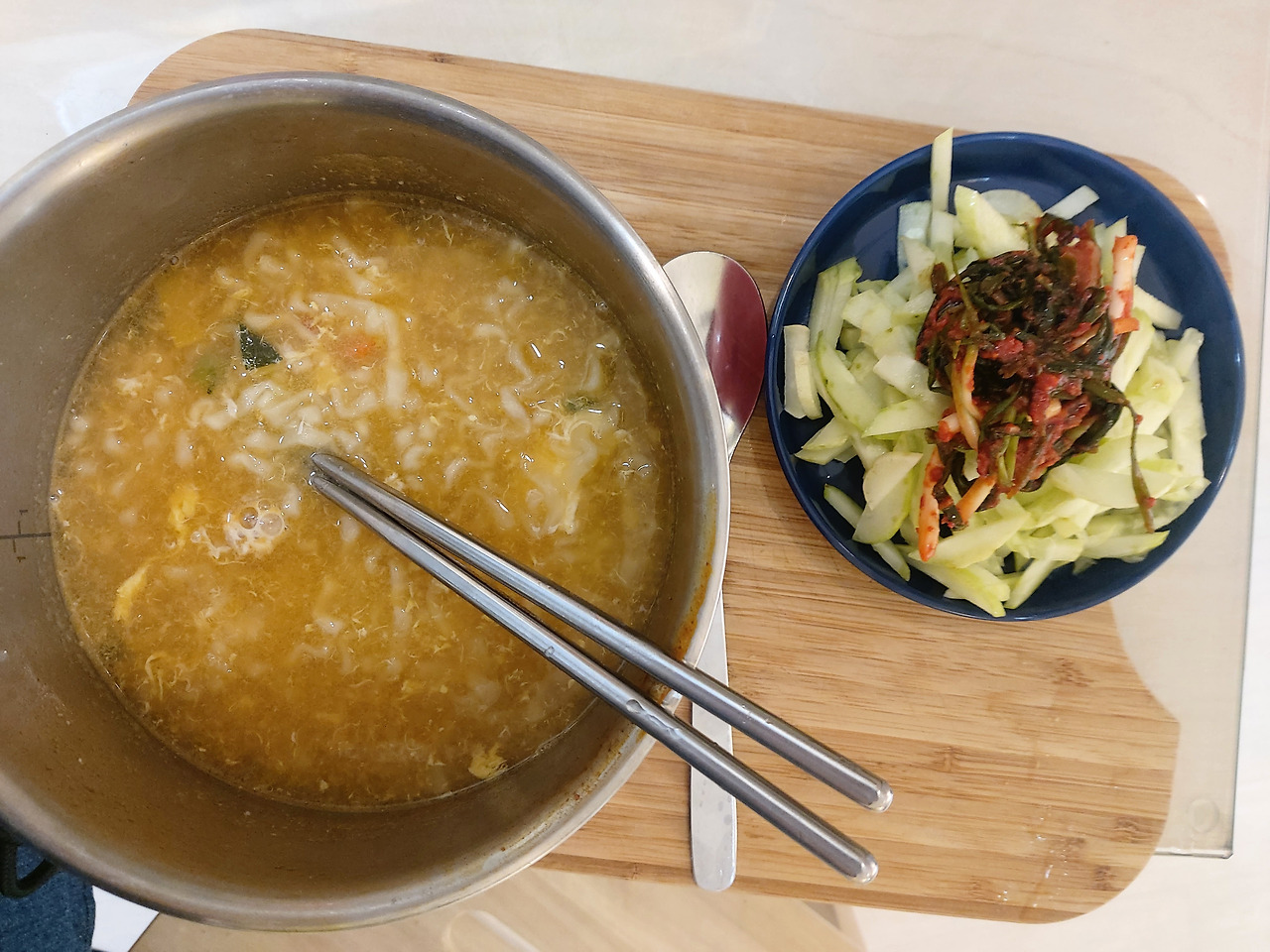 도저히 요리를 할 엄두가 나지않을 때는 레트르트 죽. 라면이 쉬운 건 어쩔 수 없다. 그래도 김치나 물김치, 대파와 오이, 달걀로 나머지 영양소의 균형을 맞춰본다.