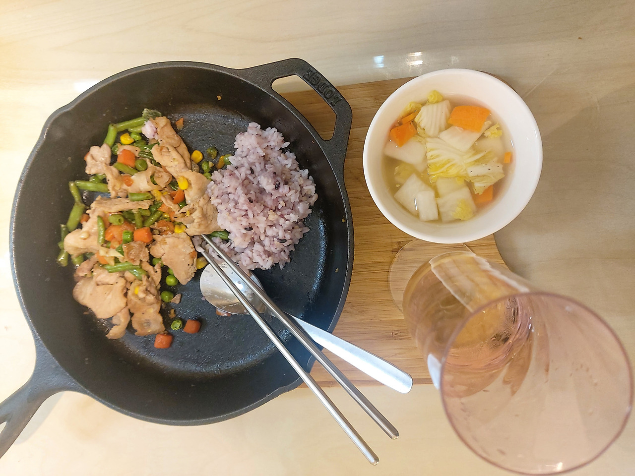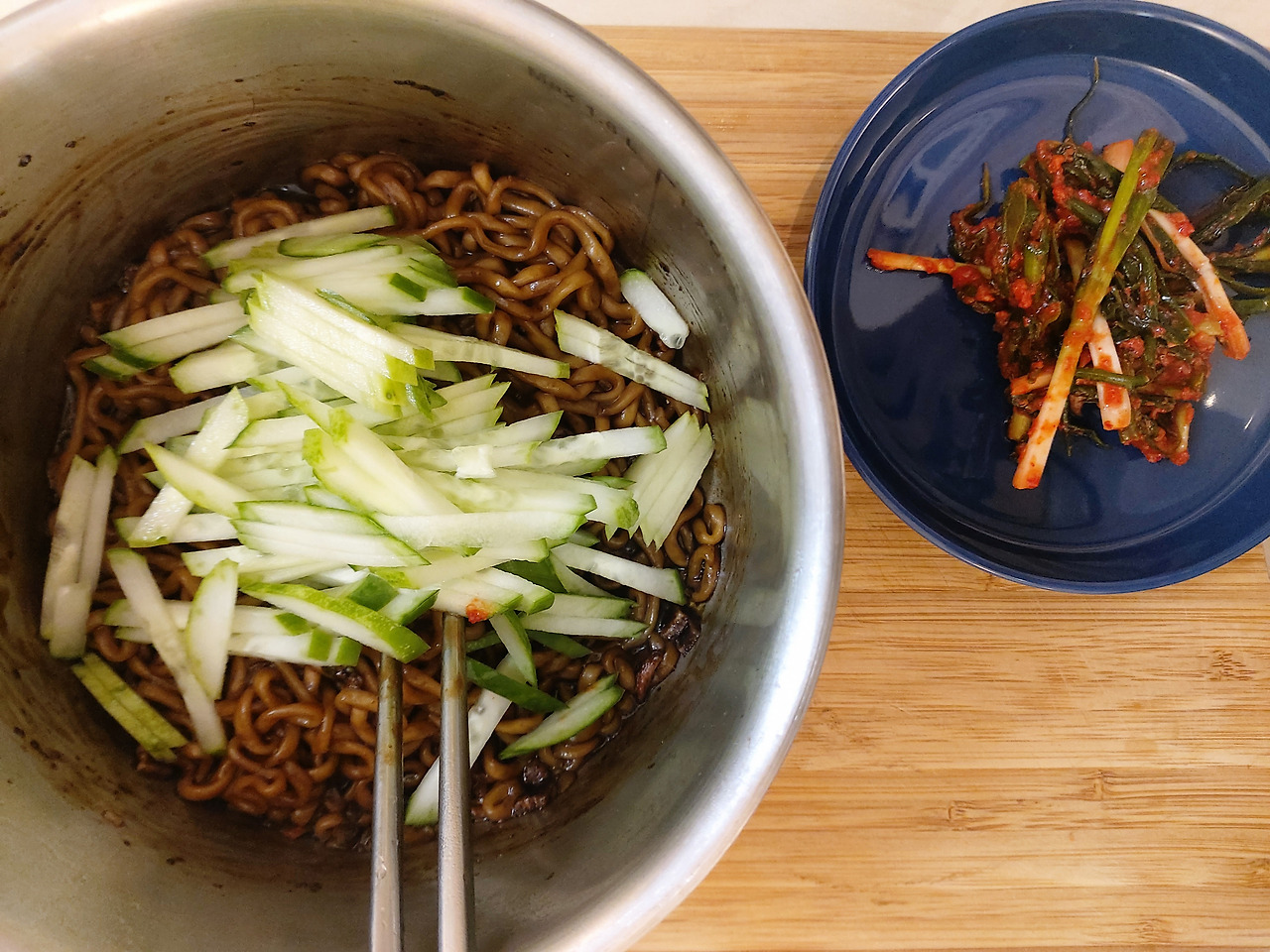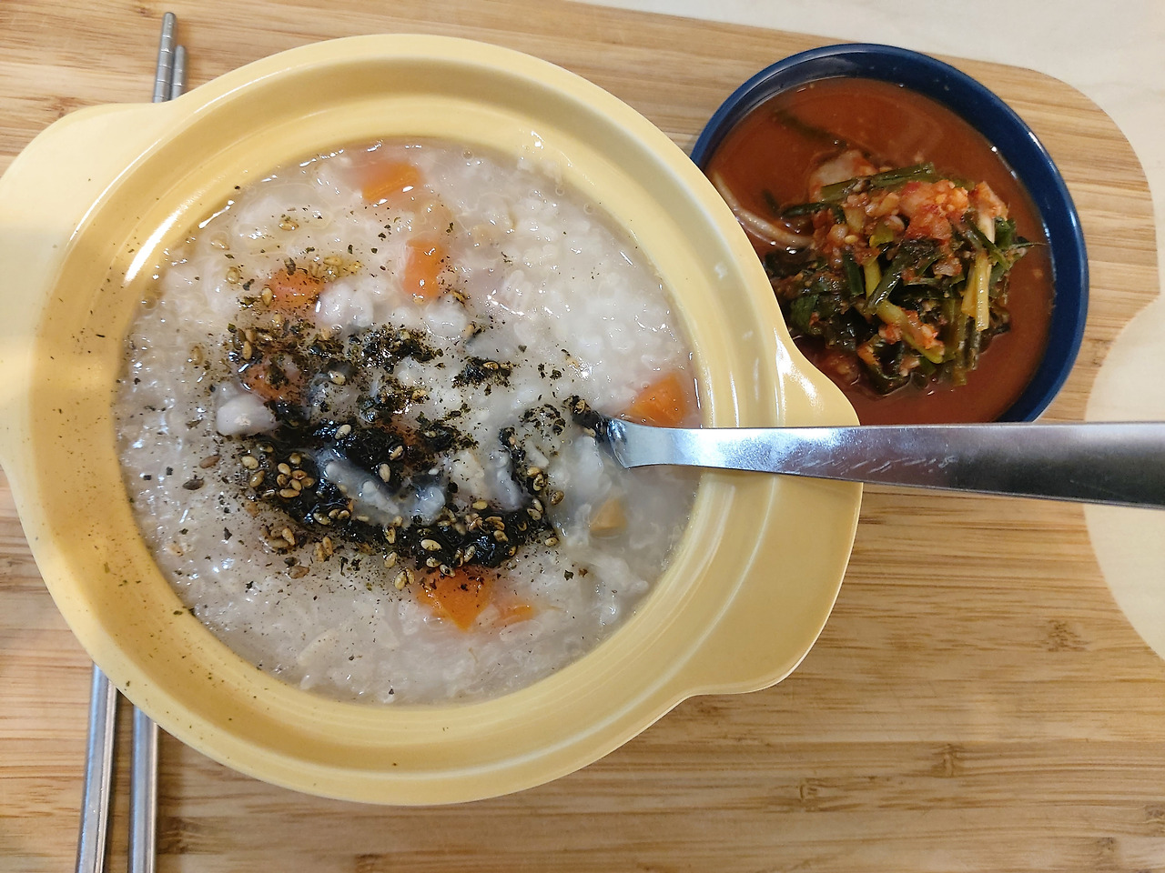 도저히 요리를 할 엄두가 나지않을 때는 레트르트 죽. 라면이 쉬운 건 어쩔 수 없다. 그래도 김치나 물김치, 대파와 오이, 달걀로 나머지 영양소의 균형을 맞춰본다.